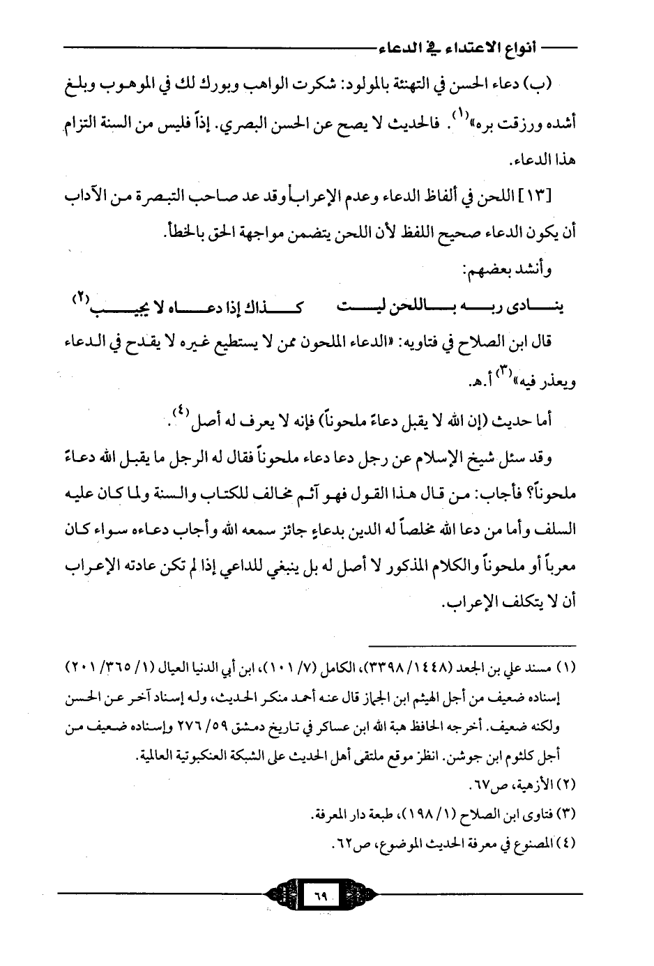 قال ابنُ الصَّلاح في فتاويه: (الدُّعاءُ الملحون ممَّن لا يستطيع غيره لا يقدح في الدُّعاء ويعذر فيه) (¬3) ا. هـ.