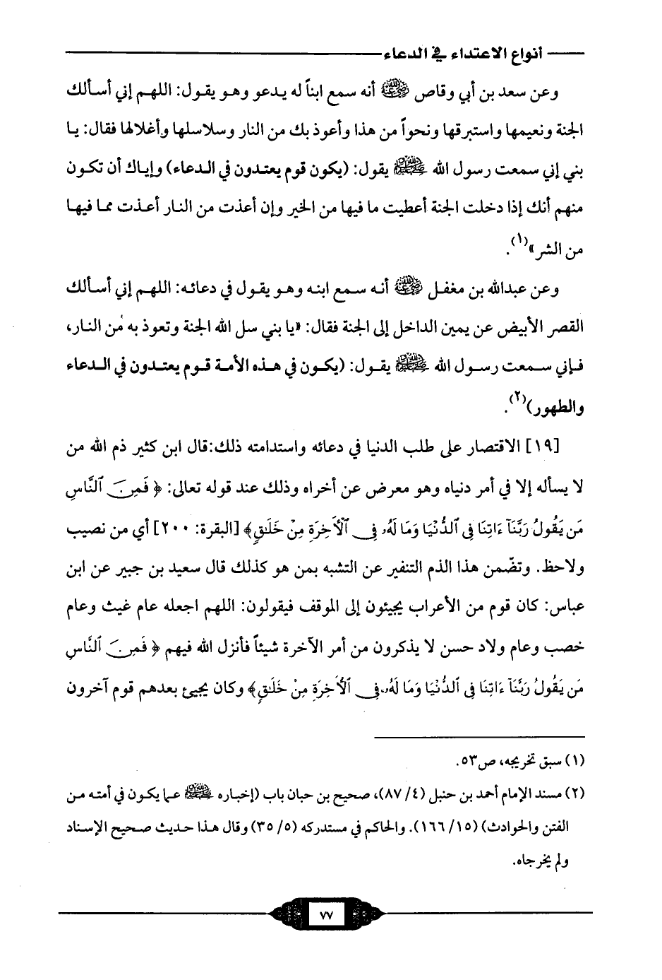 وعن سعد بن أبي وقَّاص- رضي الله عنه- أنَّه سمع ابناً له يدعو وهو يقول: اللهمَّ إنِّي أسألك الجنَّةَ ونعيمها وإستبرقها ونحواً من هذا وأعوذ بك من النار وسلاسلها وأغلالها. فقال: يا بنيَّ إنِّي سمعت رسول الله - صلى الله عليه وسلم - يقول: «يكون قوم يعتدون في الدعاء». وإيَّاك أن تكون منهم؛ إنَّك إذا دخلتَ الجنة أعطيتَ ما فيها من الخير، وإن أعذتَ من النار أعذتَ ممَّا فيها من الشَّرِّ (¬1).