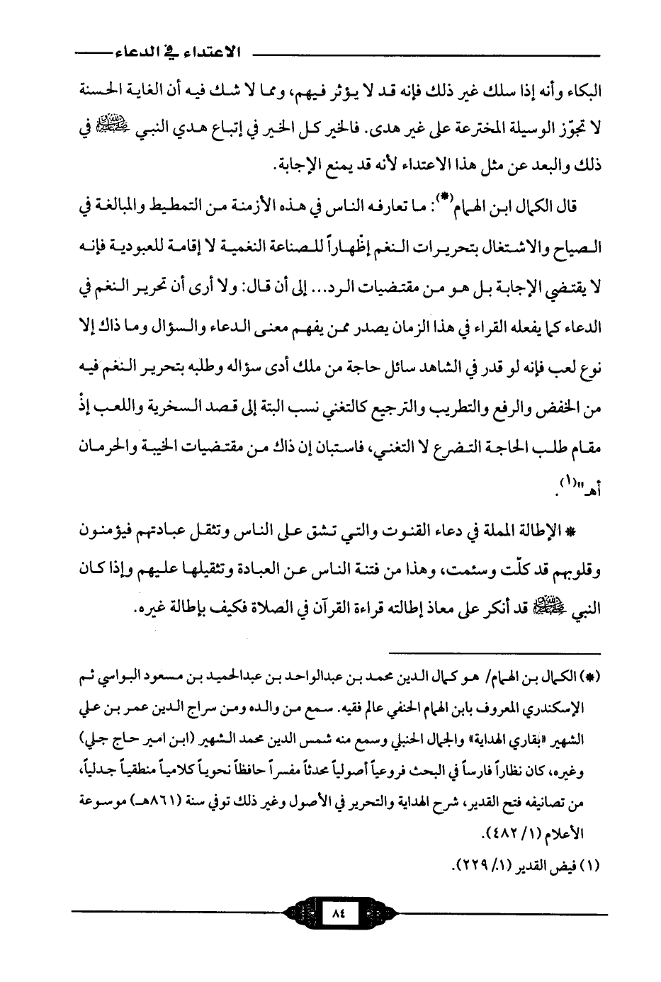 قال الكمال ابن الهمام (¬1): (ما تعارفه الناس في هذه الأزمنة من التمطيط والمبالغة في الصياح والاشتغال بتحريرات النغم إظهارا للصناعة النغمية لا إقامة للعبودية فإنه لا يقتضي الإجابة بل هو من مقتضيات الرد ... إلى أن قال: ولا أرى أن تحرير النغم في الدعاء كما يفعله القراء في هذا الزمان يصدر ممن يفهم معنى الدعاء والسؤال وما ذاك إلا نوع لعب فإنه لو قدر في الشاهد سائل حاجة من ملك أدى سؤاله وطلبه بتحرير النغم فيه من الخفض والرفع والتطريب والترجيح كالتغني نسب البتة إلى قصد السخرية واللعب إذ مقام طلب الحاجة التضرع لا التغني، فاستبيان إن ذاك من مقتضيات الخيبة والحرمان).اهـ (¬2).