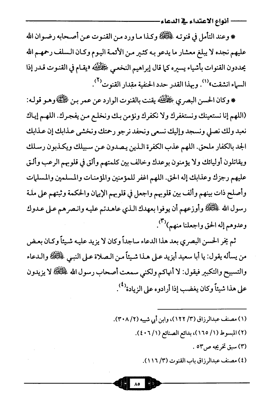 * وعند التأمل في قنوته - صلى الله عليه وسلم - وكذا ما ورد من القنوت عن أصحابه رضوان الله عليهم نجده لا يبلغ معشار ما يدعو به كثير من الأئمة اليوم وكان السلف رحمهم الله يحددون القنوت بأشياء يسيره كما قال إبراهيم النخعي رحمه الله (يقام في القنوت قدر إذا السماء انشقت) (¬1). وبهذا القدر حدد الحنفية مقدار القنوت (¬2).