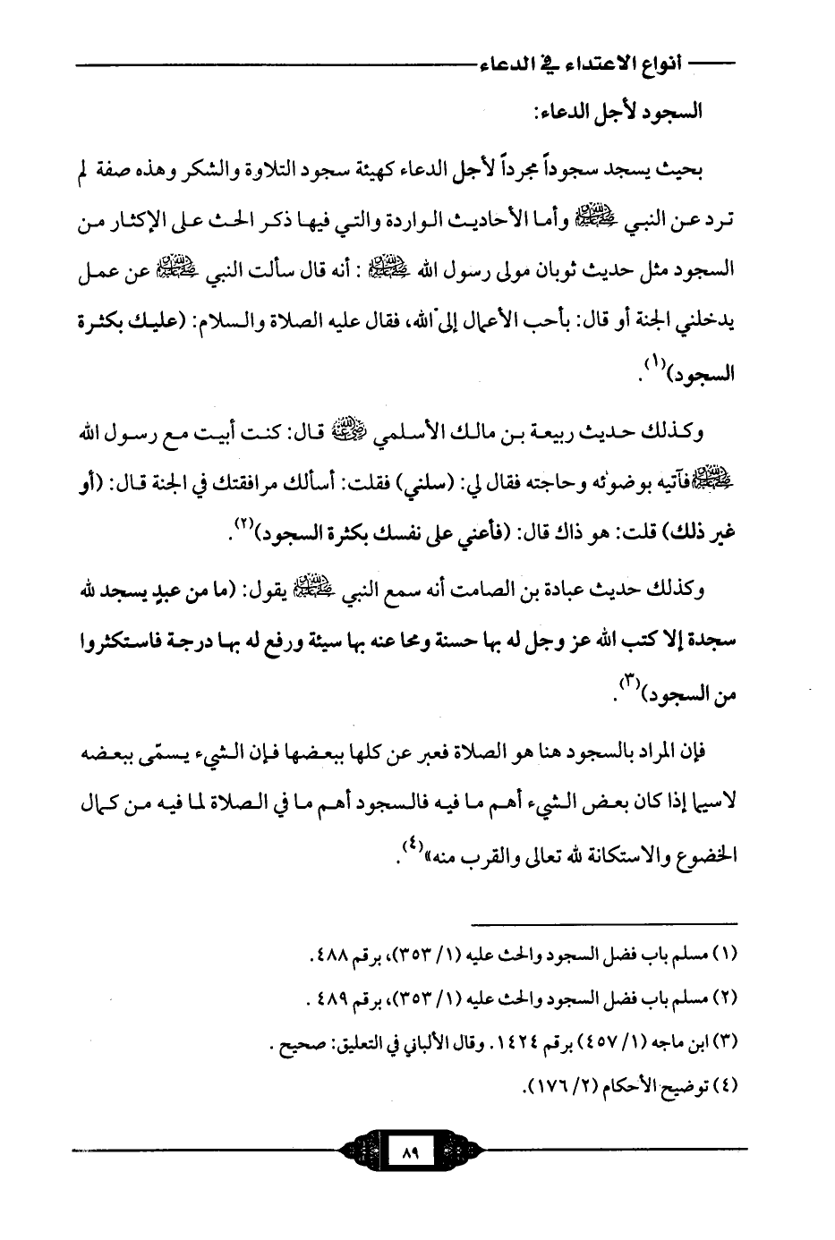 بحيث يسجد سجودا مجردا لأجل الدعاء كهيئة سجود التلاوة والشكر وهذه صفة لم ترد عن النبي - صلى الله عليه وسلم - وأما الأحاديث الواردة والتي فيها ذكر الحث على الإكثار من السجود مثل حديث ثوبان مولى رسول الله - صلى الله عليه وسلم -: أنه قال سألت النبي - صلى الله عليه وسلم - عن عمل يدخلني الجنة أو قال: بأحب الأعمال إلى الله، فقال - صلى الله عليه وسلم -: «عليك بكثرة السجود» (¬1).