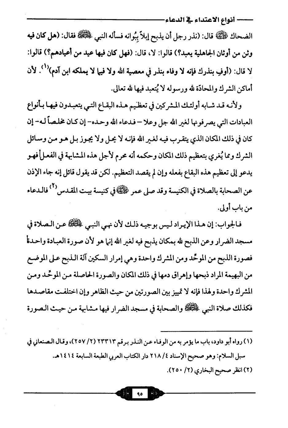 الضحاك رضي الله عنه قال: (نذر رجل أن يذبح إبلا ببوانة فسأله النبي - صلى الله عليه وسلم - فقال: «هل كان فيه وثن من أوثان الجاهلية يعبد؟» قالوا: لا، قال: «فهل كان فيها عيد من أعيادهم؟» قالوا: لا قال: «أوفِ بنذرك فإنه لا وفاء بنذر في معصية الله ولا فيما لا يملكه ابن آدم» (¬1). لأن أماكن الشرك والمحادة لله ورسوله لا يُتعبد فيها لله تعالى.