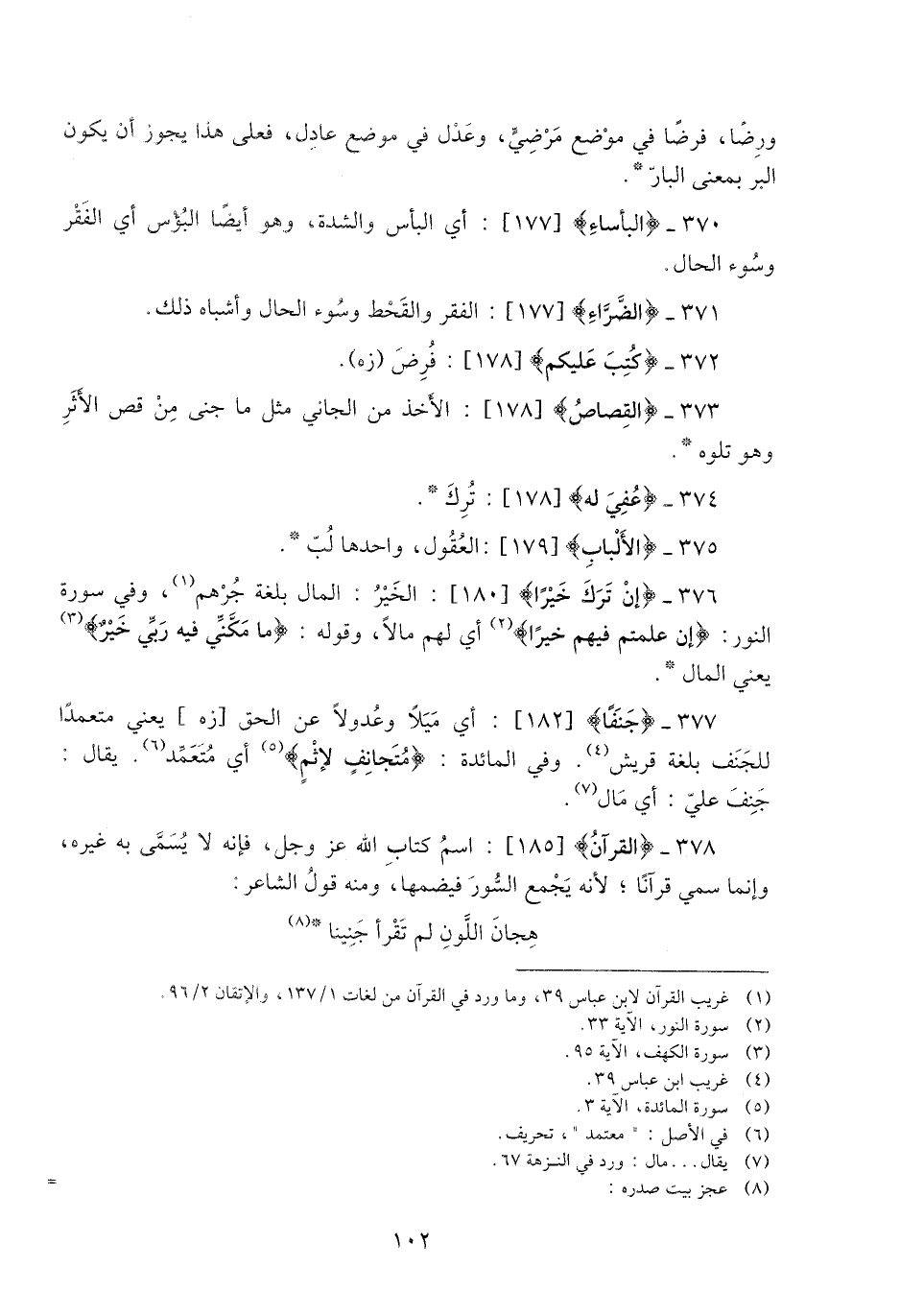 370- الْبَأْساءِ [177] : أي البأس والشدة، وهو أيضا البؤس أي الفقر وسوء الحال.