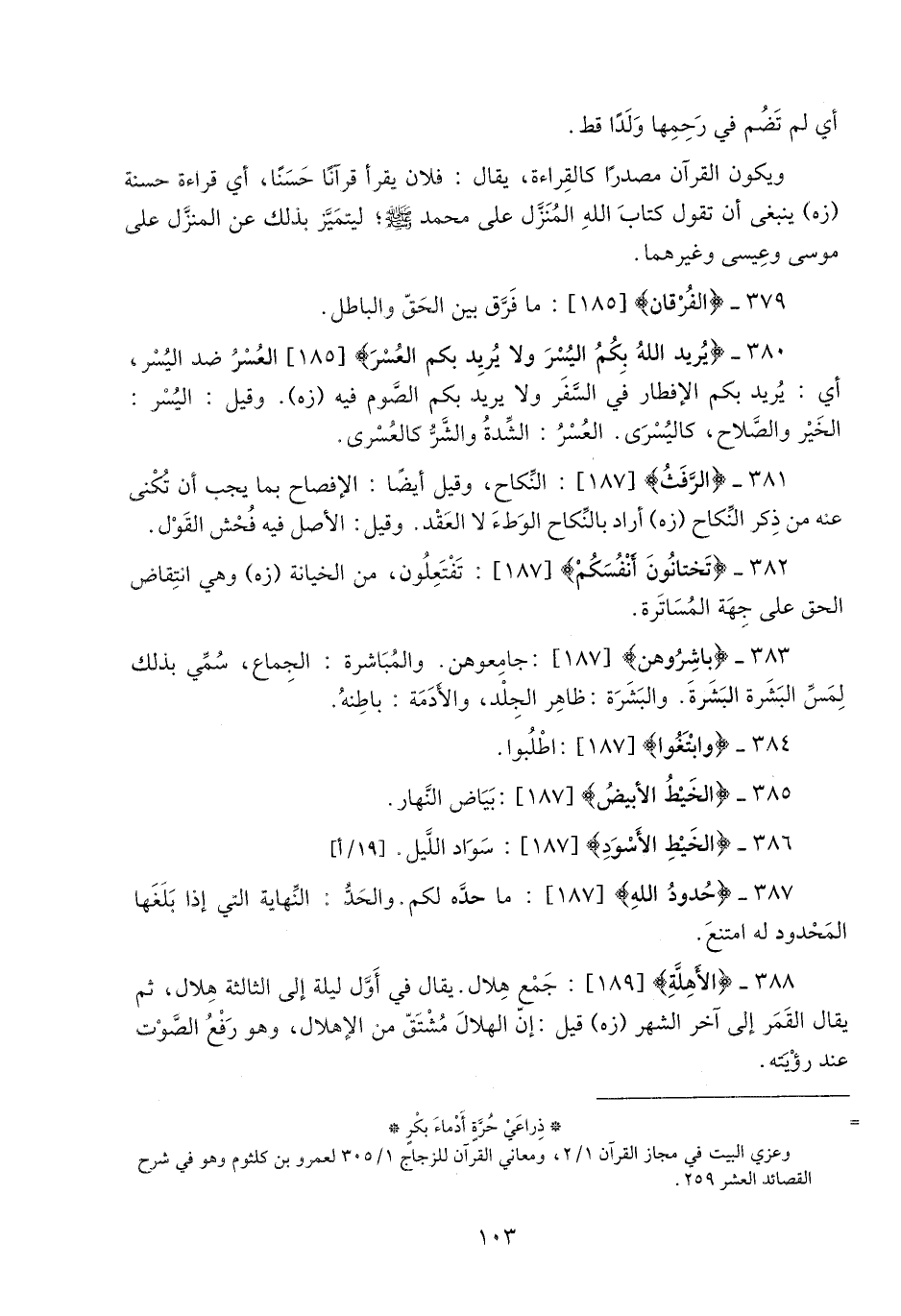 386- الْخَيْطِ الْأَسْوَدِ [187] : سواد اللّيل. [19/ أ] 387- حُدُودُ اللَّهِ [187] : ما حدّه لكم. والحدّ: النّهاية التي إذا بلغها المحدود له امتنع.