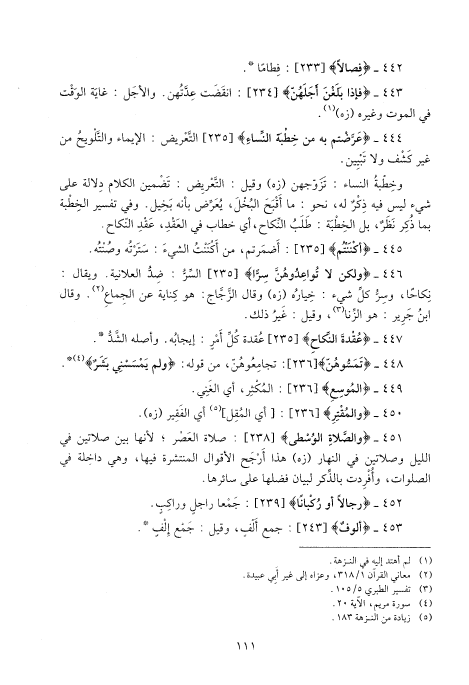443- فَإِذا بَلَغْنَ أَجَلَهُنَّ [234] : انقضت عدّتهن. والأجل: غاية الوقت في الموت وغيره (زه) «1» .