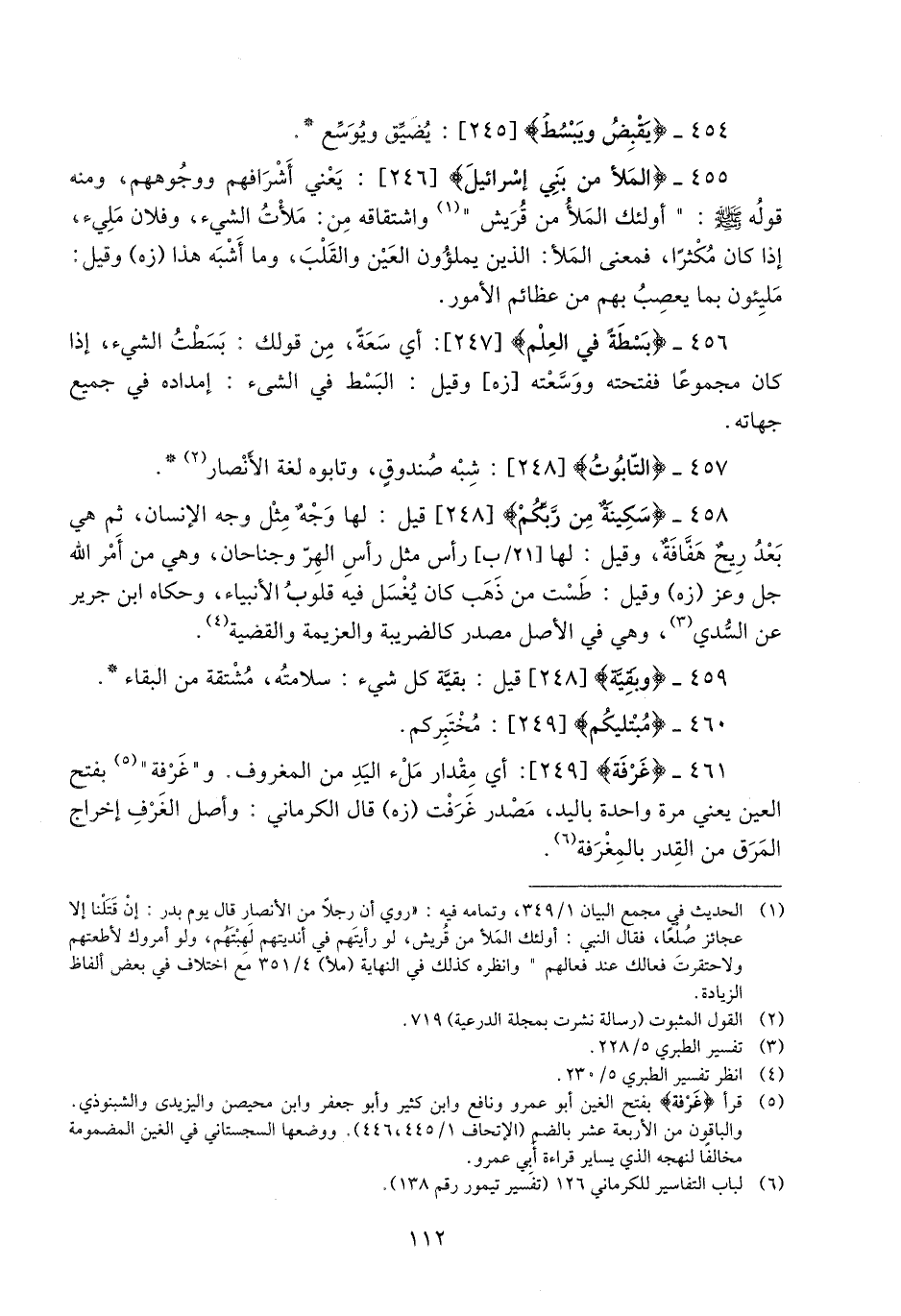 458- سَكِينَةٌ مِنْ رَبِّكُمْ [248] قيل: لها وجه مثل وجه الإنسان، ثم هي بعد ريح هفّافة، وقيل: لها [21/ ب] رأس مثل رأس الهرّ وجناحان، وهي من أمر الله جل وعز (زه) وقيل: طست من ذهب كان يغسل فيه قلوب الأنبياء، وحكاه ابن جرير عن السّدي «3» ، وهي في الأصل مصدر كالضريبة والعزيمة والقضية «4» .