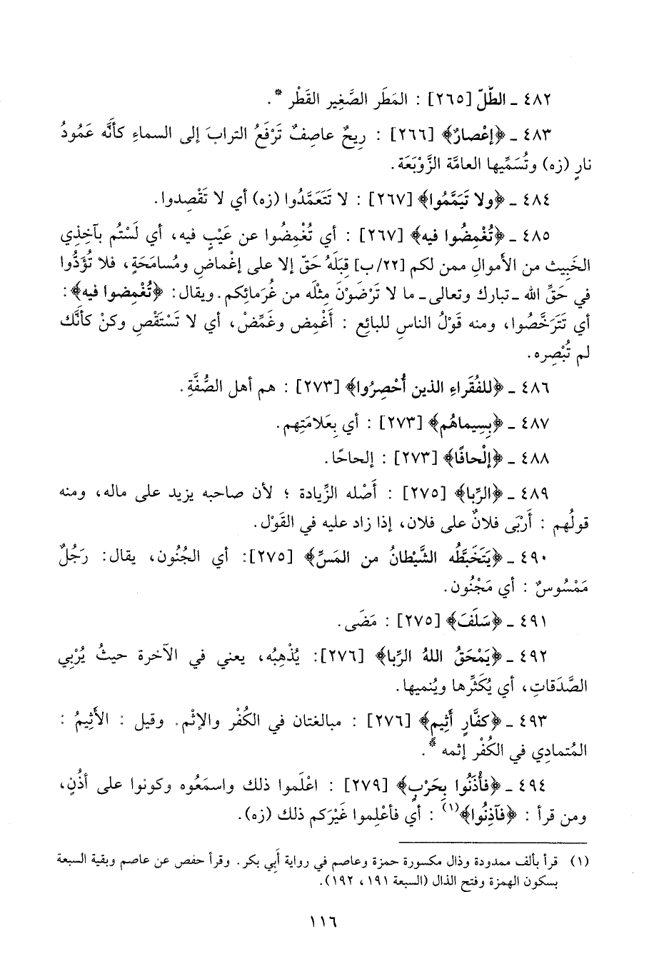 494- فَأْذَنُوا بِحَرْبٍ [279] : اعلموا ذلك واسمعوه وكونوا على أذن، ومن قرأ: فآذنوا «1» : أي فأعلموا غيركم ذلك (زه) .