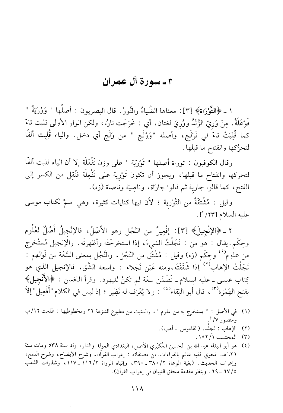 1- التَّوْراةَ [3] : معناها الضّياء والنّور. قال البصريون: أصلها «وورية» فوعلة، من وري الزّند ووري لغتان، أي: خرجت ناره، ولكن الواو الأولى قلبت تاء كما قلبت تاء في تولج، وأصله «وولج» من ولج أي دخل. والياء قلبت ألفا لتحرّكها وانفتاح ما قبلها.