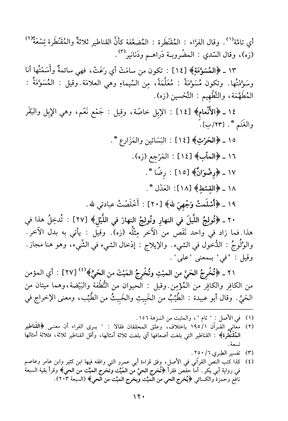 (2) معاني القرآن 1/ 195 باختلاف، وعلق المحققان فقالا: «يرى الفراء أن معنى الْقَناطِيرِ الْمُقَنْطَرَةِ: القناطير التي بلغت أضعافها أي بلغت ثلاثة أمثالها، وأقل القناطير ثلاثة، فثلاثة أمثالها تسعة.