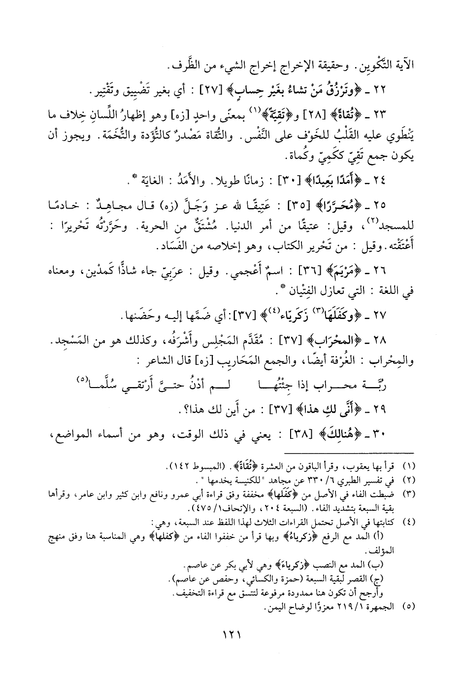 (3) ضبطت الفاء في الأصل من كَفَّلَها مخففة وفق قراءة أبي عمرو ونافع وابن كثير وابن عامر، وقرأها بقية السبعة بتشديد الفاء. (السبعة 204، والإتحاف 1/ 475) .