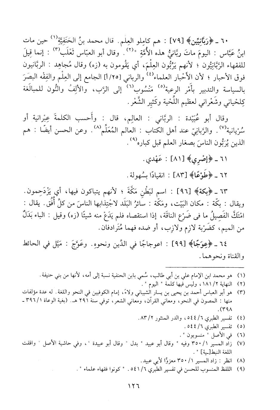60- رَبَّانِيِّينَ [79] : هم كاملو العلم. قال محمد بن الحنفيّة «1» حين مات ابن عبّاس: اليوم مات ربّانيّ هذه الأمّة» «2» . وقال أبو العبّاس ثعلب «3» : إنما قيل للفقهاء الرّبّانيّون لأنهم يربّون العلم، أي يقومون به (زه) وقال مجاهد: الربّانيون فوق الأحبار لأن الأحبار العلماء «4» والرباني [25/ أ] الجامع إلى العلم والفقه البصر بالسياسة والتدبير بأمر الرعية «5» منسوب «6» إلى الرّب، والألف والنّون للمبالغة كلحياني وشعراني لعظيم اللّحية وكثير الشّعر.
