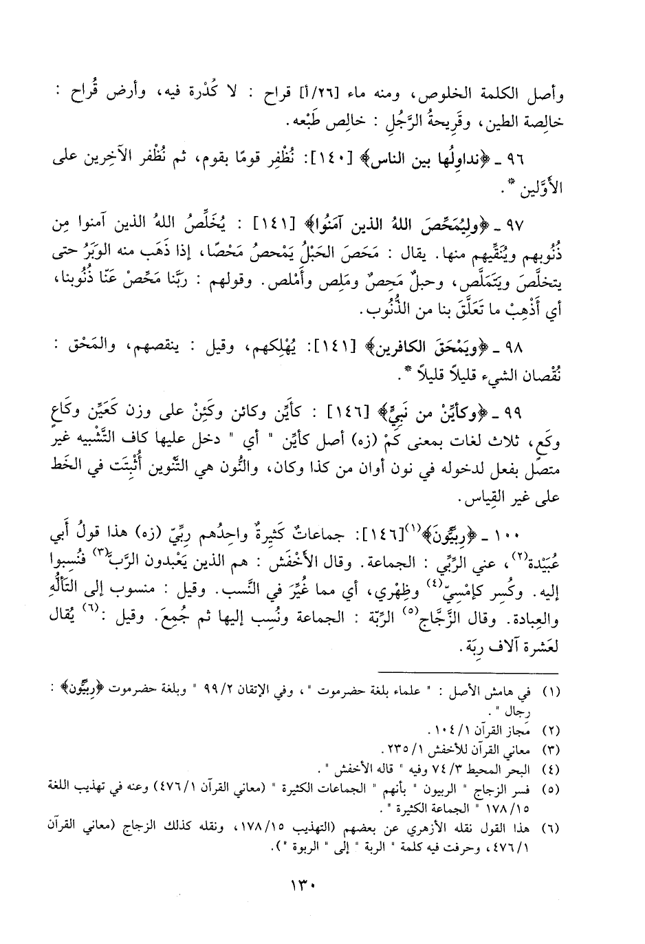 (5) فسر الزجاج «الربيون» بأنهم «الجماعات الكثيرة» (معاني القرآن 1/ 476) وعنه في تهذيب اللغة 15/ 178 «الجماعة الكثيرة» .