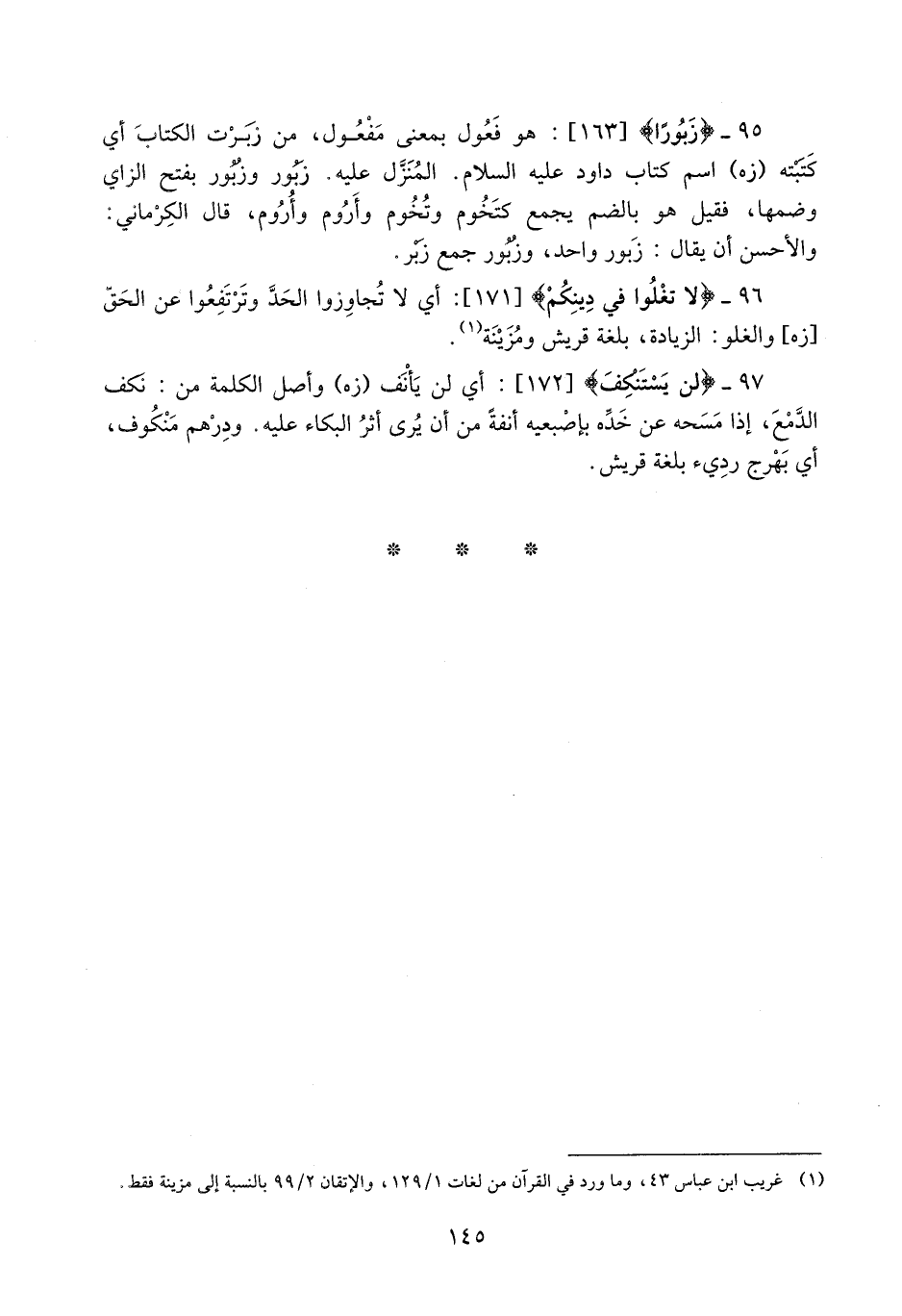 95- زَبُوراً [163] : هو فعول بمعنى مفعول، من زبرت الكتاب أي كتبته (زه) اسم كتاب داود عليه السلام. المنزّل عليه. زبور وزبور بفتح الزاي وضمها، فقيل هو بالضم يجمع كتخوم وتخوم وأروم وأروم، قال الكرماني: