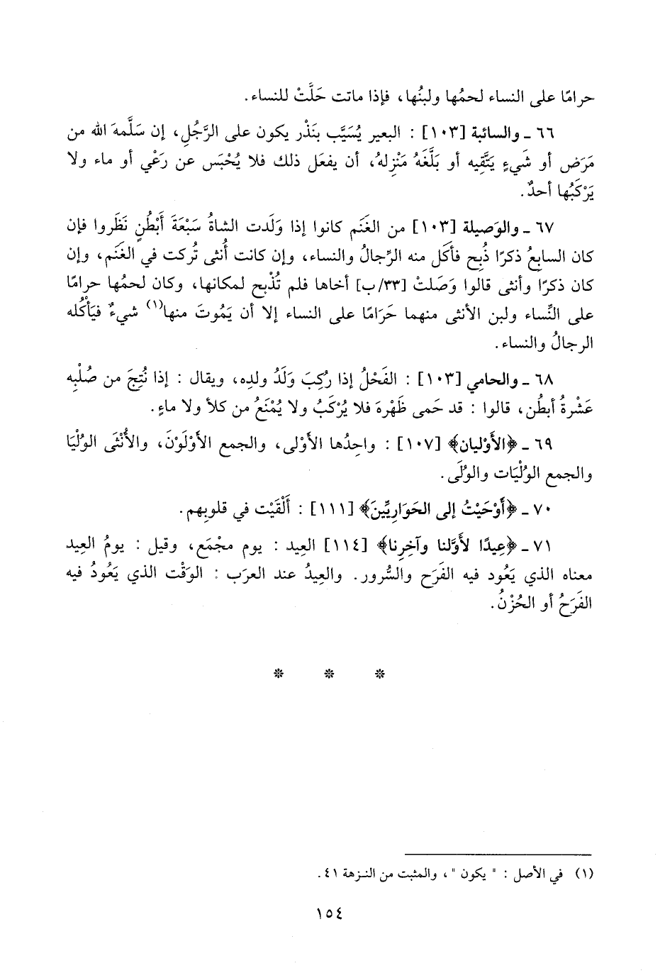 66- والسائبة [103] : البعير يسيّب بنذر يكون على الرّجل، إن سلّمه الله من مرض أو شيء يتّقيه أو بلّغه منزله، أن يفعل ذلك فلا يحبس عن رعي أو ماء ولا يركبها أحد.