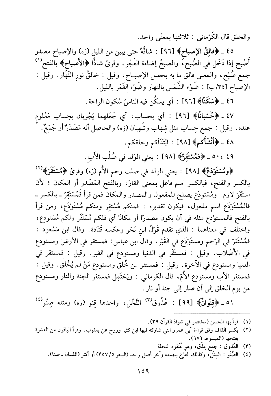 47- حُسْباناً [96] : أي بحساب، أي جعلهما يجريان بحساب معلوم عنده. وقيل: جمع حساب مثل شهاب وشهبان (زه) والحاصل أنه مصدر أو جمع.