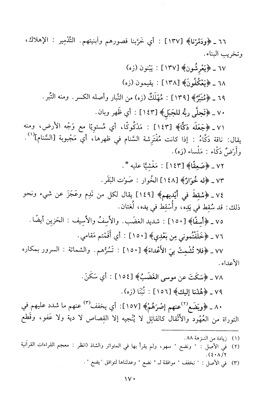 67- يَعْرِشُونَ [137] : يبنون (زه) 68- يَعْكُفُونَ [138] : يقيمون (زه) 69- مُتَبَّرٌ [139] : مهلك (زه) من التّبار وأصله الكسر. ومنه التّبر.