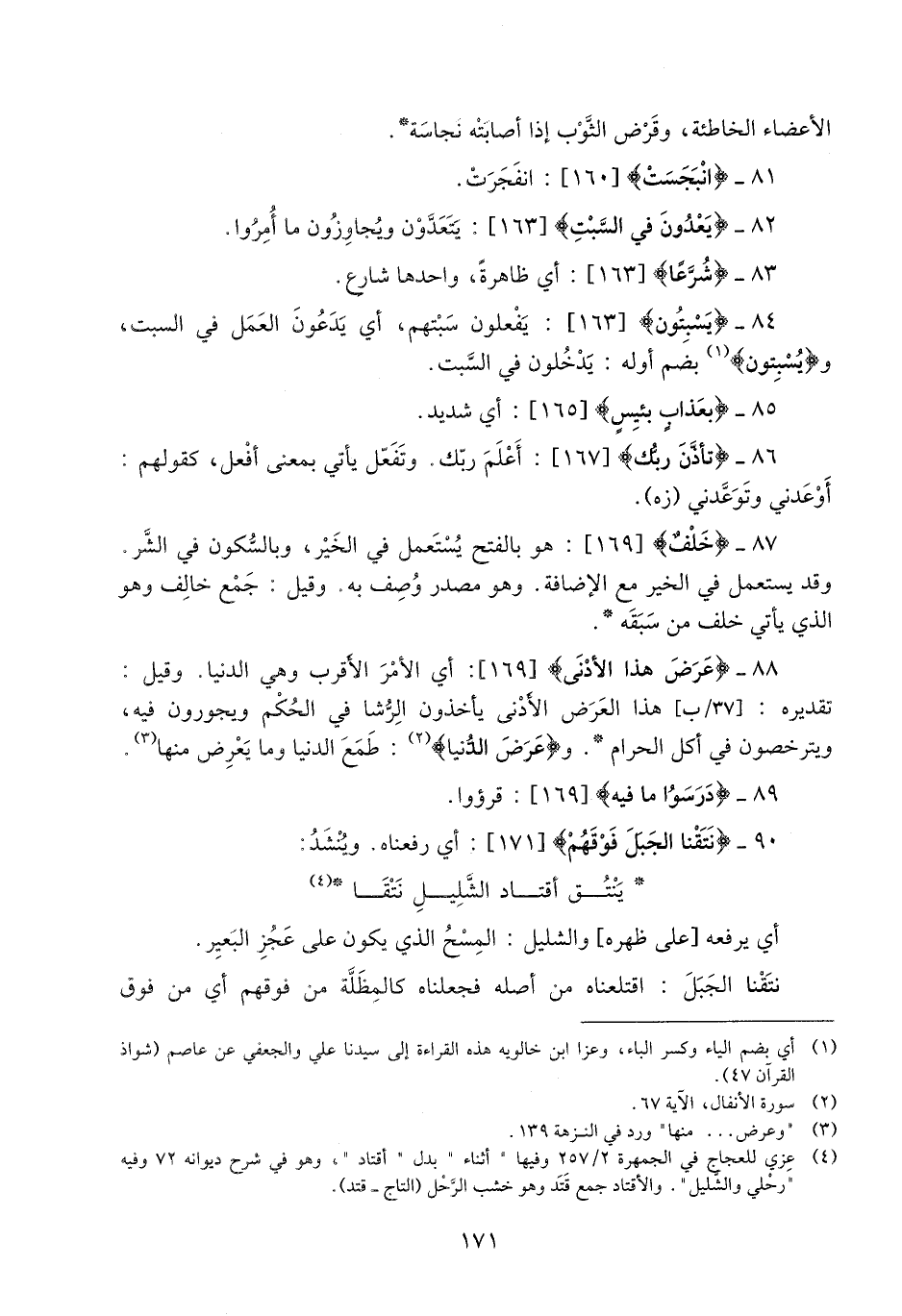 90- نَتَقْنَا الْجَبَلَ فَوْقَهُمْ [171] : أي رفعناه. وينشد: