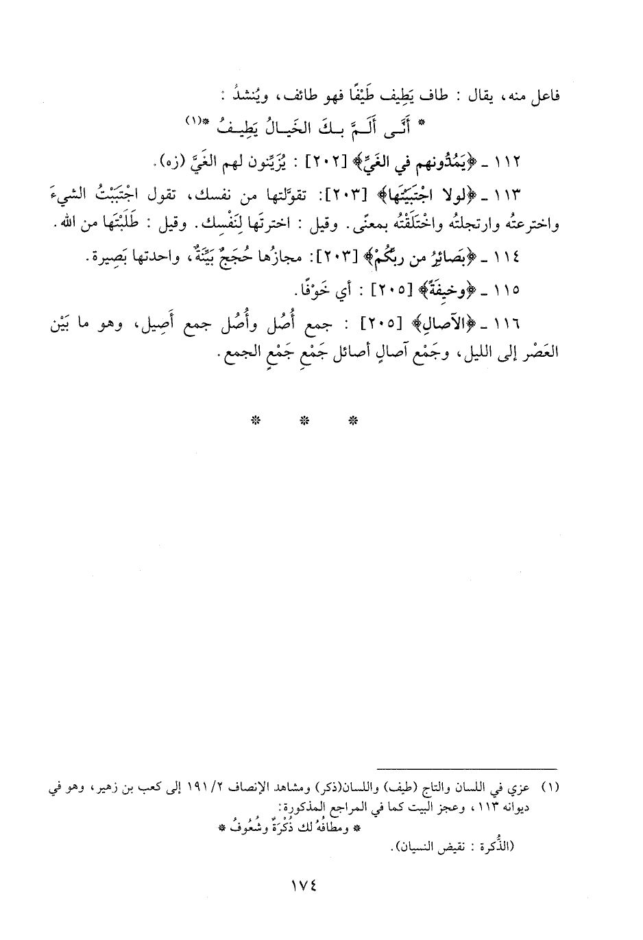(1) عزي في اللسان والتاج (طيف) واللسان (ذكر) ومشاهد الإنصاف 2/ 191 إلى كعب بن زهير، وهو في ديوانه 113، وعجز البيت كما في المراجع المذكورة: