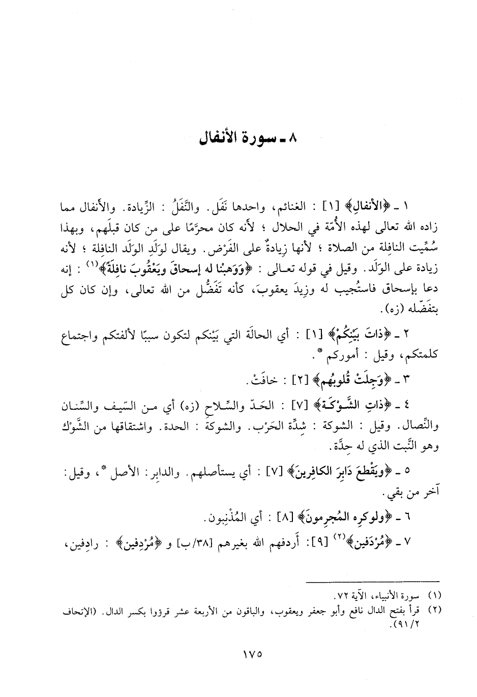 1- الْأَنْفالِ [1] : الغنائم، واحدها نفل. والنّفل: الزّيادة. والأنفال مما زاده الله تعالى لهذه الأمّة في الحلال لأنه كان محرّما على من كان قبلهم، وبهذا سمّيت النافلة من الصلاة لأنها زيادة على الفرض. ويقال لولد الولد النافلة لأنه زيادة على الولد. وقيل في قوله تعالى: وَوَهَبْنا لَهُ إِسْحاقَ وَيَعْقُوبَ نافِلَةً «1» : إنه دعا بإسحاق فاستجيب له وزيد يعقوب، كأنه تفضّل من الله تعالى، وإن كان كل بتفضّله (زه) .