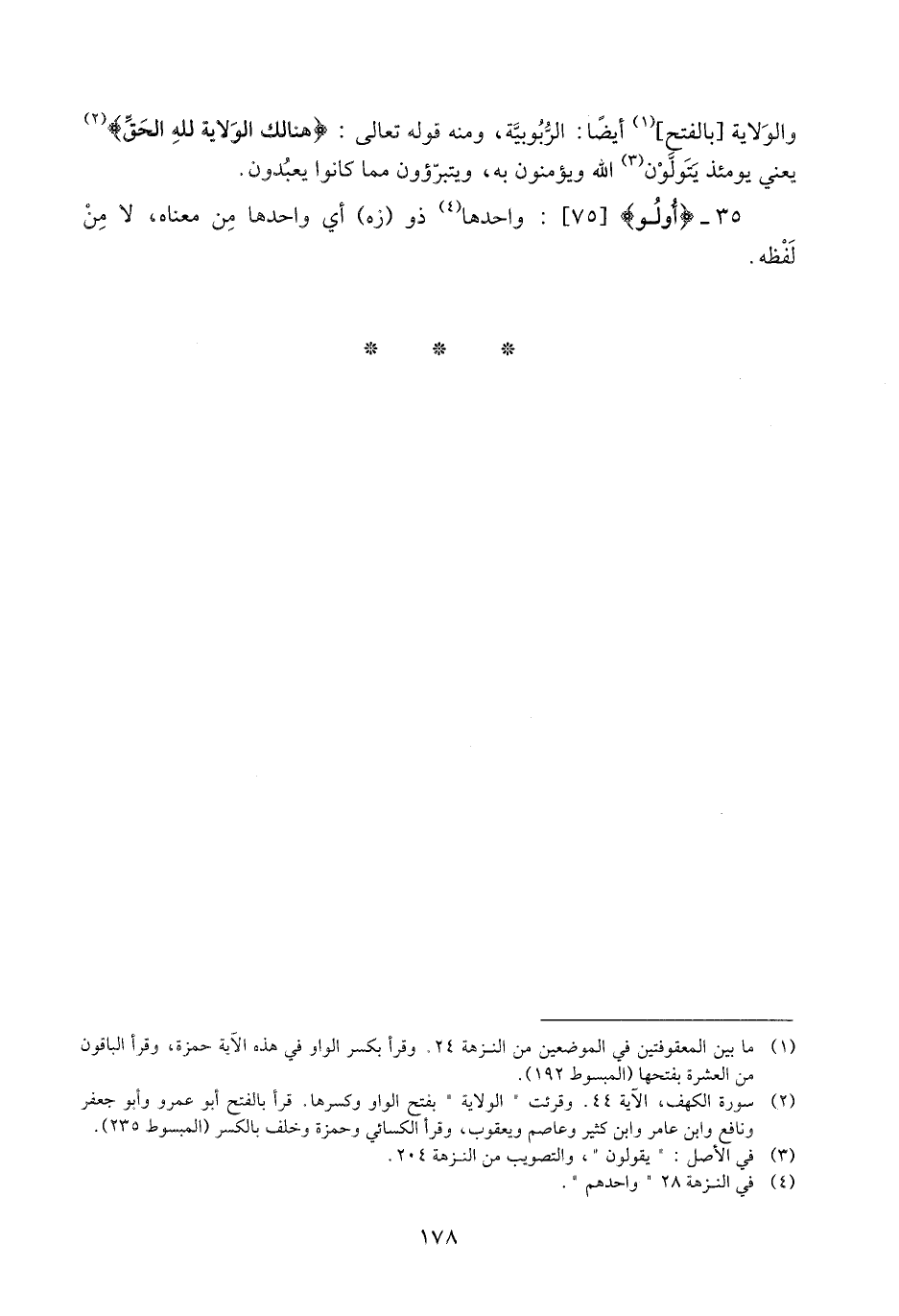 (1) ما بين المعقوفتين في الموضعين من النزهة 24. وقرأ بكسر الواو في هذه الآية حمزة، وقرأ الباقون من العشرة بفتحها (المبسوط 192) .