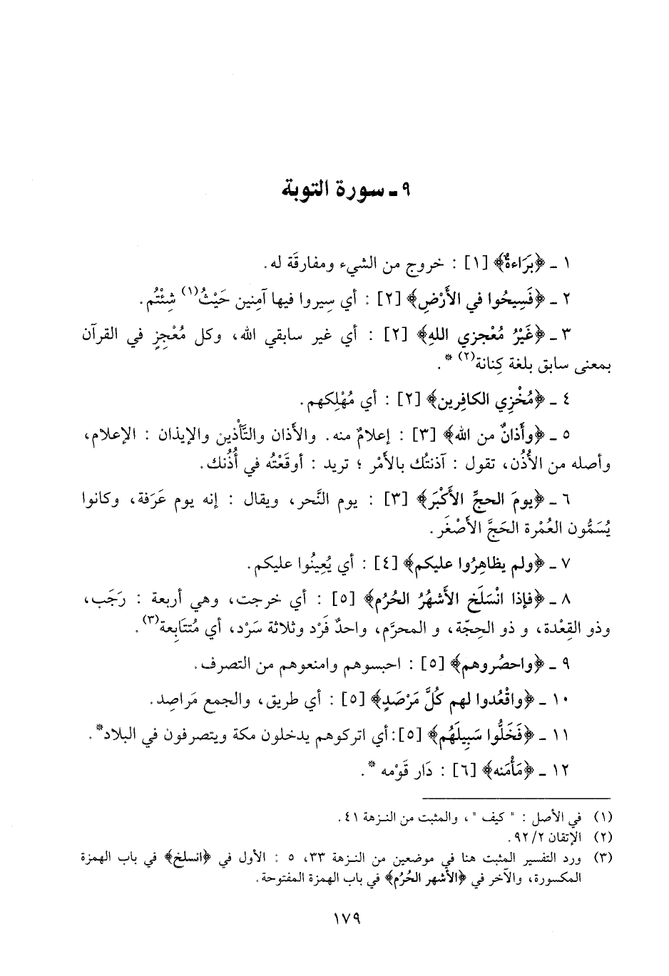 (3) ورد التفسير المثبت هنا في موضعين من النزهة 33، 5: الأول في انْسَلَخَ في باب الهمزة المكسورة، والآخر في الْأَشْهُرُ الْحُرُمُ في باب الهمزة المفتوحة.