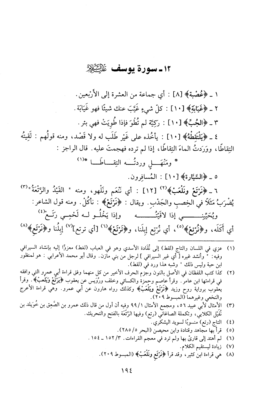 (2) كذا كتب اللفظان في الأصل بالنون وجزم الحرف الأخير من كل منهما وفق قراءة أبي عمرو التي وافقه في قراءتها ابن عامر. وقرأ عاصم وحمزة والكسائي وخلف ورويس عن يعقوب يَرْتَعْ وَيَلْعَبْ. وقرأ يعقوب برواية روح وزيد نرتع ويلعب وكذلك رواه هارون عن أبي عمرو. وهي قراءة الأعرج والنخعي وغيرهما (المبسوط 209) .