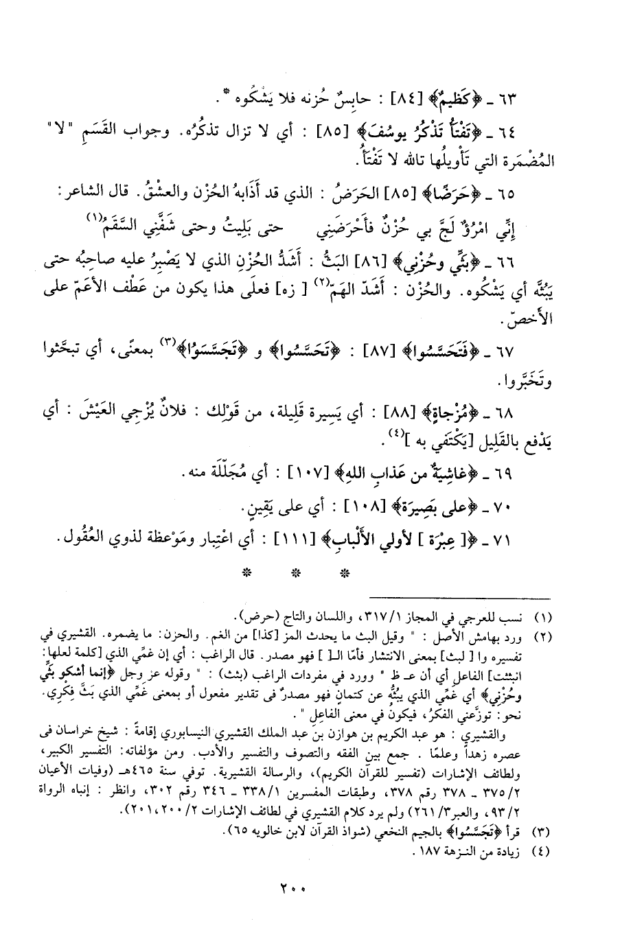 والقشيري: هو عبد الكريم بن هوازن بن عبد الملك القشيري النيسابوري إقامة: شيخ خراسان في عصره زهدا وعلما. جمع بين الفقه والتصوف والتفسير والأدب. ومن مؤلفاته: التفسير الكبير، ولطائف الإشارات (تفسير للقرآن الكريم) ، والرسالة القشيرية. توفي سنة 465 هـ (وفيات الأعيان 2/ 375- 378 رقم 378، وطبقات المفسرين 1/ 338- 346 رقم 302، وانظر: إنباه الرواة 2/ 93، والعبر 3/ 261) ولم يرد كلام القشيري في لطائف الإشارات 2/ 200، 201) .