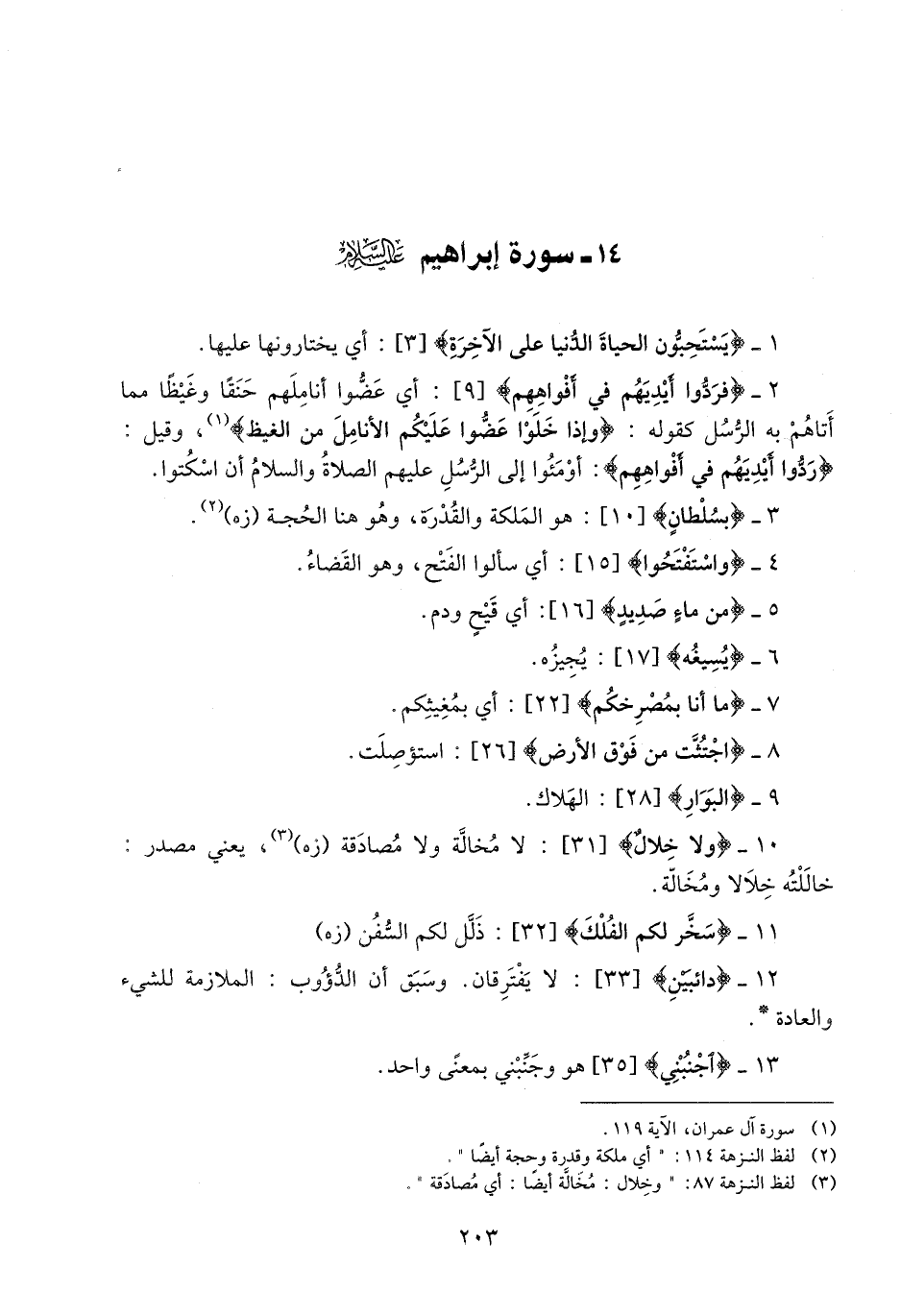 11- سَخَّرَ لَكُمُ الْفُلْكَ [32] : ذلّل لكم السّفن (زه) 12- دائِبَيْنِ [33] : لا يفترقان. وسبق أن الدّؤوب: الملازمة للشيء والعادة.