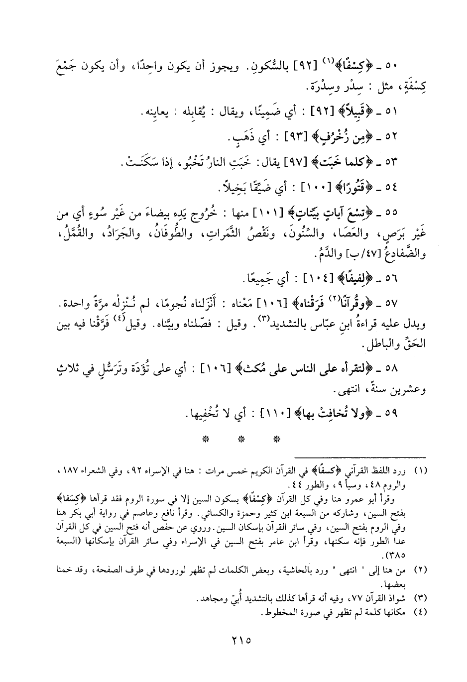 (1) ورد اللفظ القرآني كِسَفاً في القرآن الكريم خمس مرات: هنا في الإسراء 92، وفي الشعراء 187، والروم 48، وسبأ 9، والطور 44.