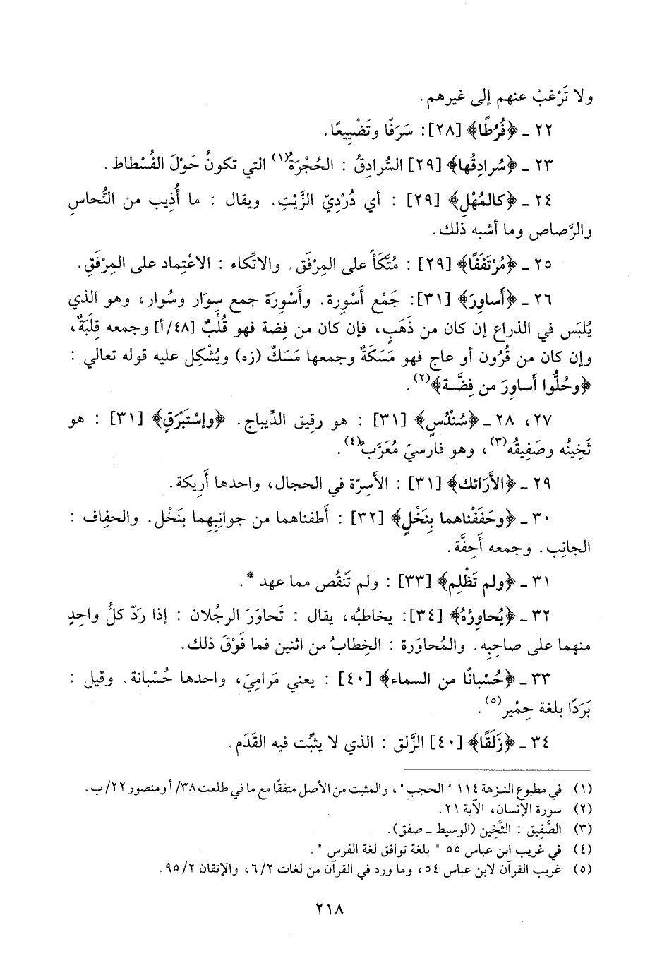 26- أَساوِرَ [31] : جمع أسورة. وأسورة جمع سوار وسوار، وهو الذي يلبس في الذراع إن كان من ذهب، فإن كان من فضة فهو قلب [48/ أ] وجمعه قلبة، وإن كان من قرون أو عاج فهو مسكة وجمعها مسك (زه) ويشكل عليه قوله تعالى: