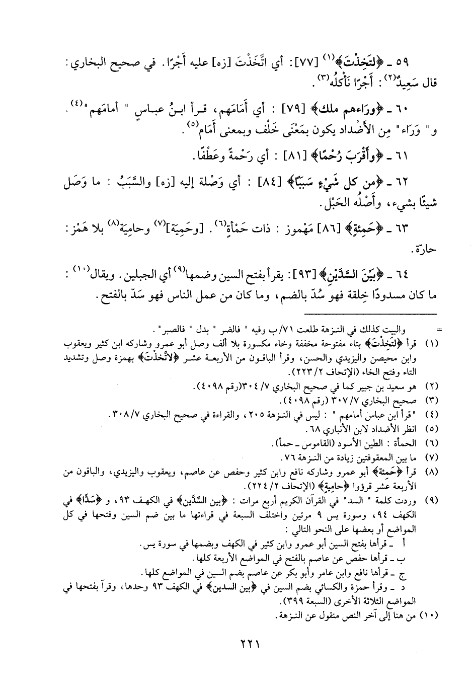 (9) وردت كلمة «السد» في القرآن الكريم أربع مرات: بَيْنَ السَّدَّيْنِ في الكهف 93، وسَدًّا في الكهف 94، وسورة يس 9 مرتين واختلف السبعة في قراءتها ما بين ضم السين وفتحها في كل المواضع أو بعضها على النحو التالي: