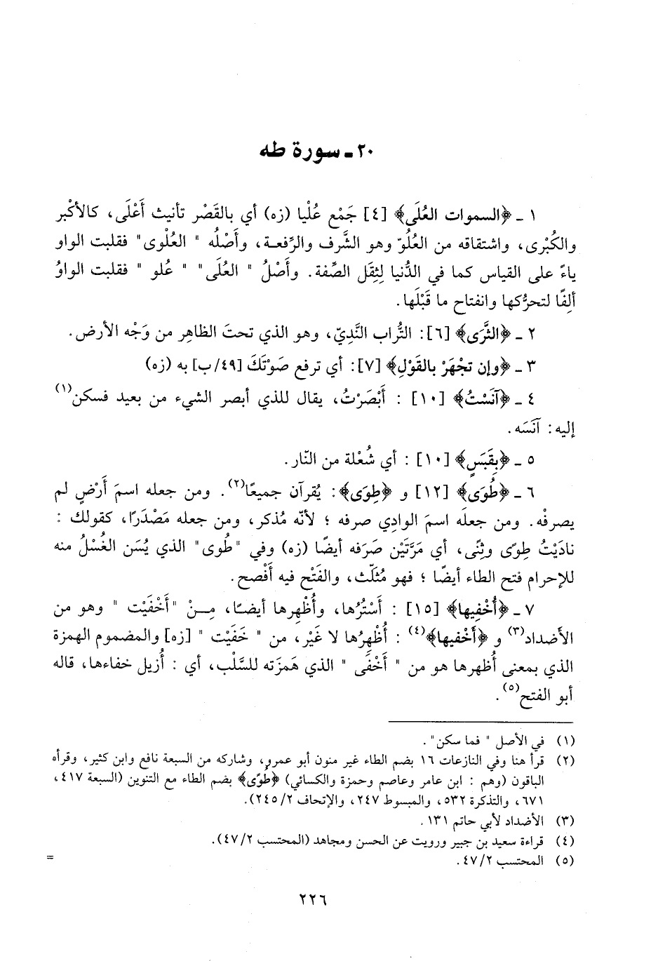 1- السَّماواتِ الْعُلى [4] جمع عليا (زه) أي بالقصر تأنيث أعلى، كالأكبر والكبرى، واشتقاقه من العلوّ وهو الشّرف والرّفعة، وأصله «العلوي» فقلبت الواو ياء على القياس كما في الدّنيا لثقل الصّفة. وأصل «العلى» «علو» فقلبت الواو ألفا لتحرّكها وانفتاح ما قبلها.