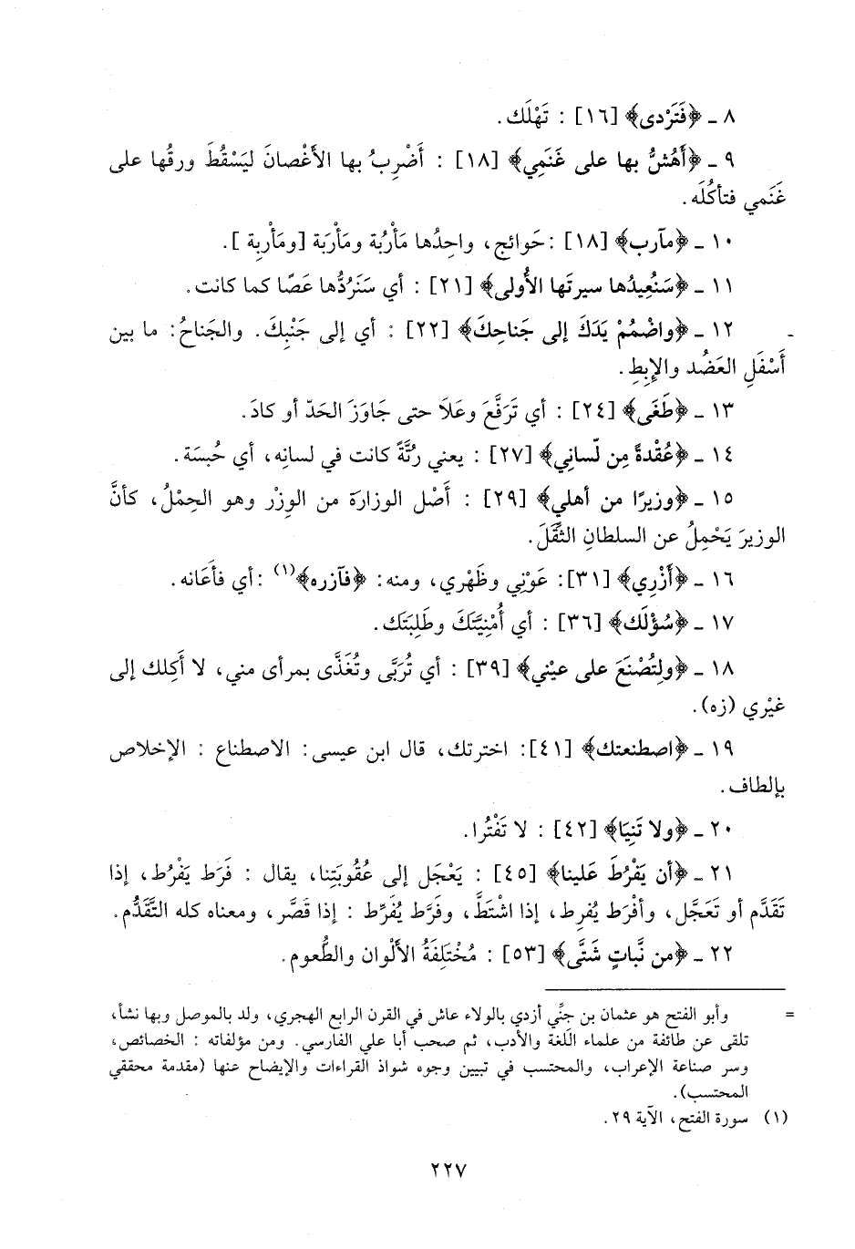 12- وَاضْمُمْ يَدَكَ إِلى جَناحِكَ [22] : أي إلى جنبك. والجناح: ما بين أسفل العضد والإبط.