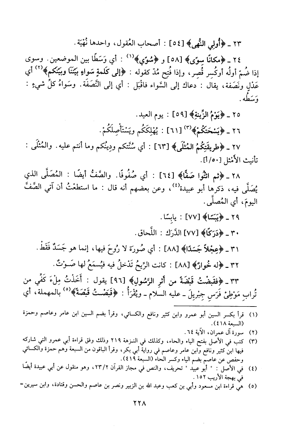 33- فَقَبَضْتُ قَبْضَةً مِنْ أَثَرِ الرَّسُولِ [96] يقول: أخذت ملء كفّي من تراب موطئ فرس جبريل- عليه السلام- ويقرأ: فَقَبَضْتُ قَبْضَةً «5» بالمهملة، أي