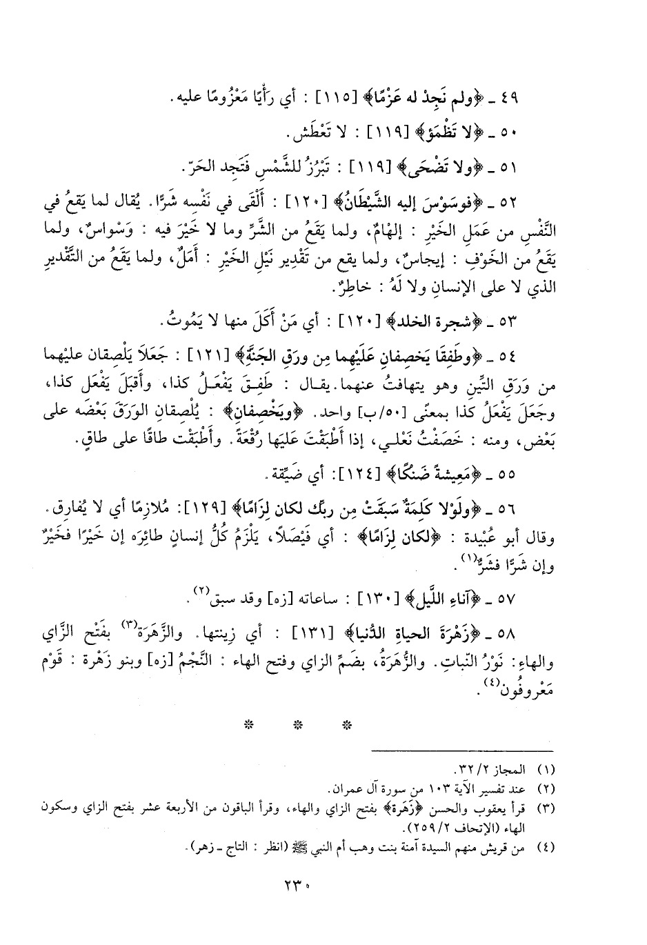 (3) قرأ يعقوب والحسن زَهْرَةَ بفتح الزاي والهاء، وقرأ الباقون من الأربعة عشر بفتح الزاي وسكون الهاء (الإتحاف 2/ 259) .