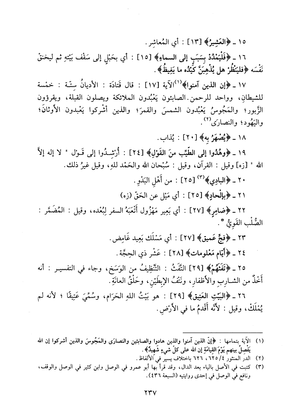 21- بِإِلْحادٍ [25] : أي ميل عن الحقّ (زه) 22- ضامِرٍ [27] : أي بعير مهزول أتعبه السفر لبعده، وقيل: المضمّر: