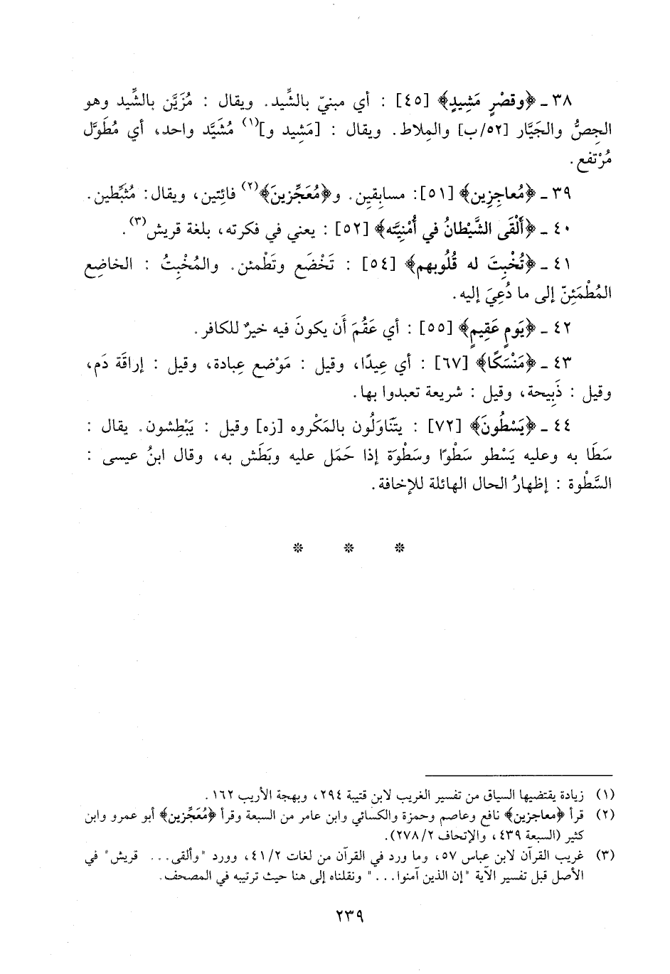 38- وَقَصْرٍ مَشِيدٍ [45] : أي مبنيّ بالشّيد. ويقال: مزيّن بالشّيد وهو الجصّ والجيّار [52/ ب] والملاط. ويقال: [مشيد و] «1» مشيّد واحد، أي مطوّل مرتفع.