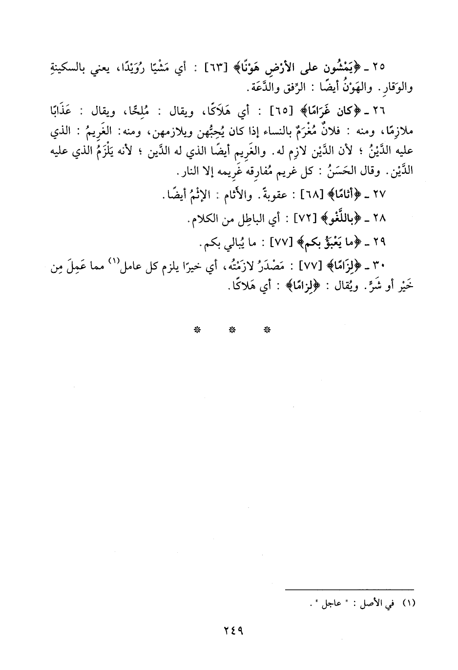 25- يَمْشُونَ عَلَى الْأَرْضِ هَوْناً [63] : أي مشيا رويدا، يعني بالسكينة والوقار. والهون أيضا: الرّفق والدّعة.