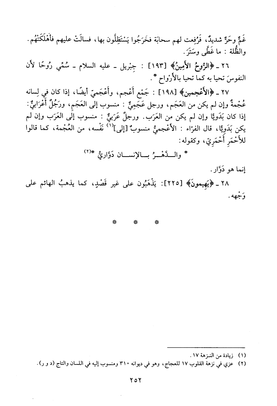 27- الْأَعْجَمِينَ [198] : جمع أعجم، وأعجميّ أيضا، إذا كان في لسانه عجمة وإن لم يكن من العجم، ورجل عجميّ: منسوب إلى العجم، ورجل أعرابيّ: