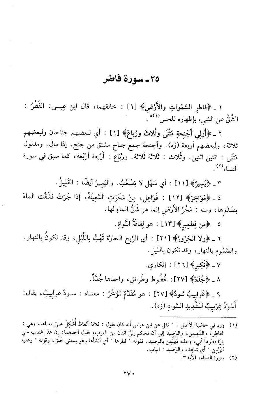 2- أُولِي أَجْنِحَةٍ مَثْنى وَثُلاثَ وَرُباعَ [1] : أي لبعضهم جناحان ولبعضهم ثلاثة، ولبعضهم أربعة (زه) . وأجنحة جمع جناح مشتق من جنح، إذا مال. ومدلول.