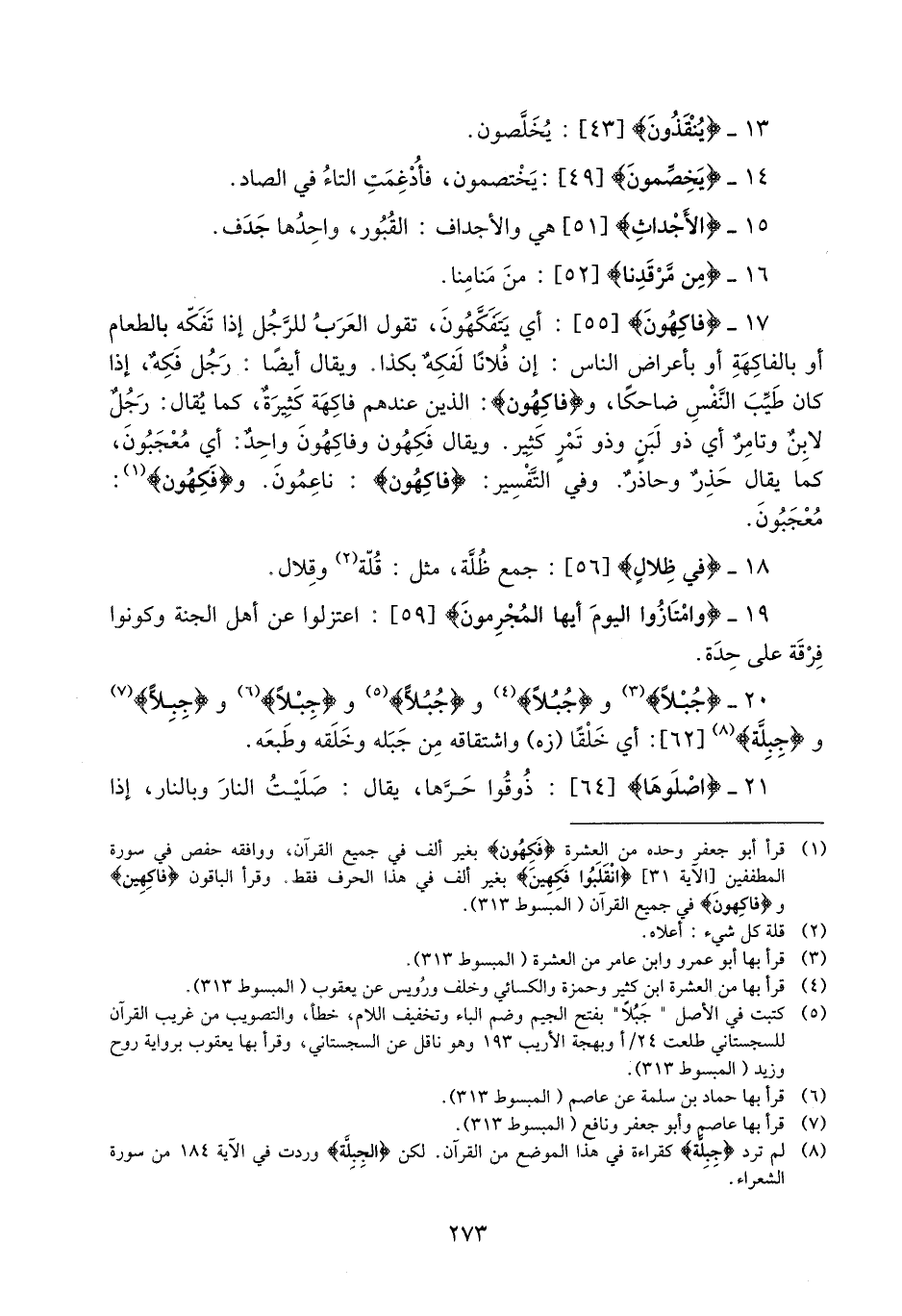 (1) قرأ أبو جعفر وحده من العشرة فكهون بغير ألف في جميع القرآن، ووافقه حفص في سورة المطففين [الآية 31] انْقَلَبُوا فَكِهِينَ بغير ألف في هذا الحرف فقط. وقرأ الباقون فاكهين وفاكِهُونَ في جميع القرآن (المبسوط 313) .