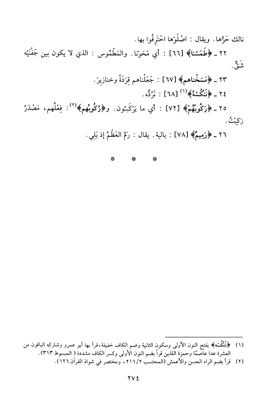 (1) نُنَكِّسْهُ بفتح النون الأولى وسكون الثانية وضم الكاف خفيفة، قرأ بها أبو عمرو وشاركه الباقون من العشرة عدا عاصما وحمزة اللذين قرءا بضم النون الأولى وكسر الكاف مشددة (المبسوط 313) .