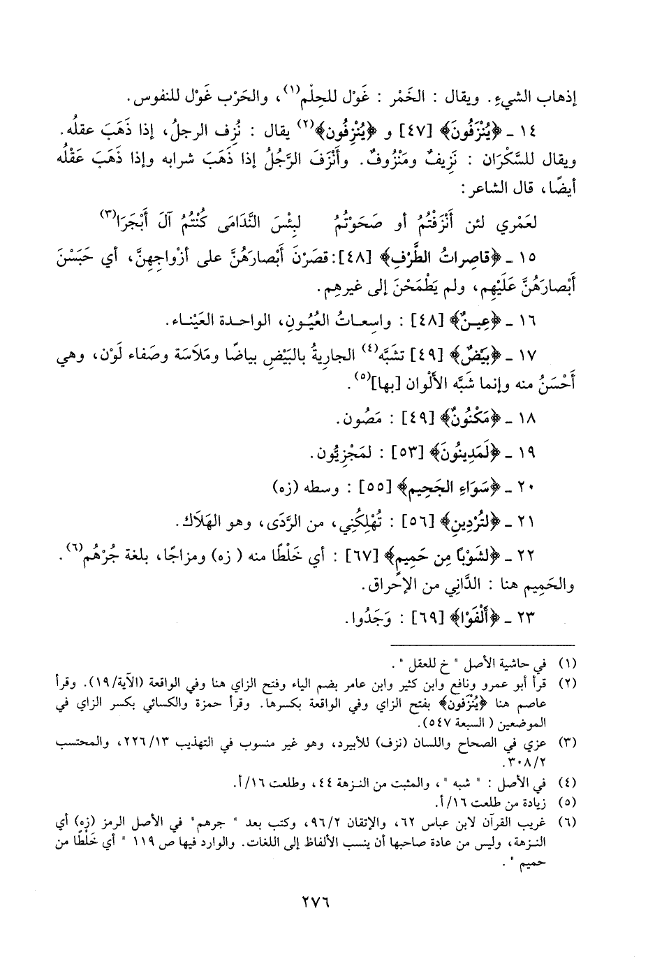 (2) قرأ أبو عمرو ونافع وابن كثير وابن عامر بضم الياء وفتح الزاي هنا وفي الواقعة (الآية/ 19) . وقرأ عاصم هنا يُنْزَفُونَ بفتح الزاي وفي الواقعة بكسرها. وقرأ حمزة والكسائي بكسر الزاي في الموضعين (السبعة 547) .
