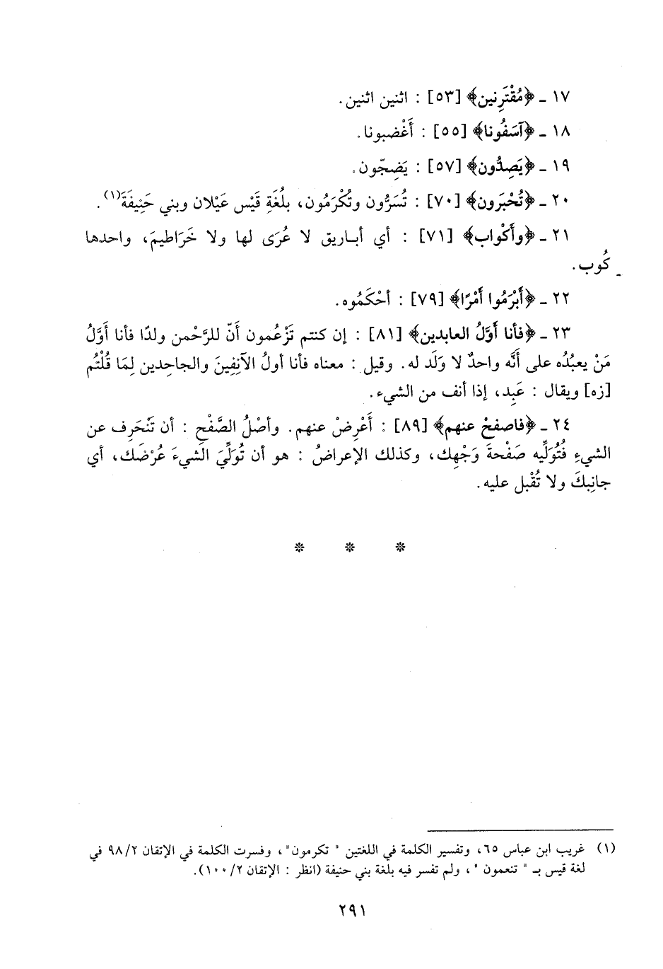 (1) غريب ابن عباس 65، وتفسير الكلمة في اللغتين «تكرمون» ، وفسرت الكلمة في الإتقان 2/ 98 في لغة قيس ب «تنعمون» ، ولم تفسر فيه بلغة بني حنيفة (انظر: الإتقان 2/ 100) .