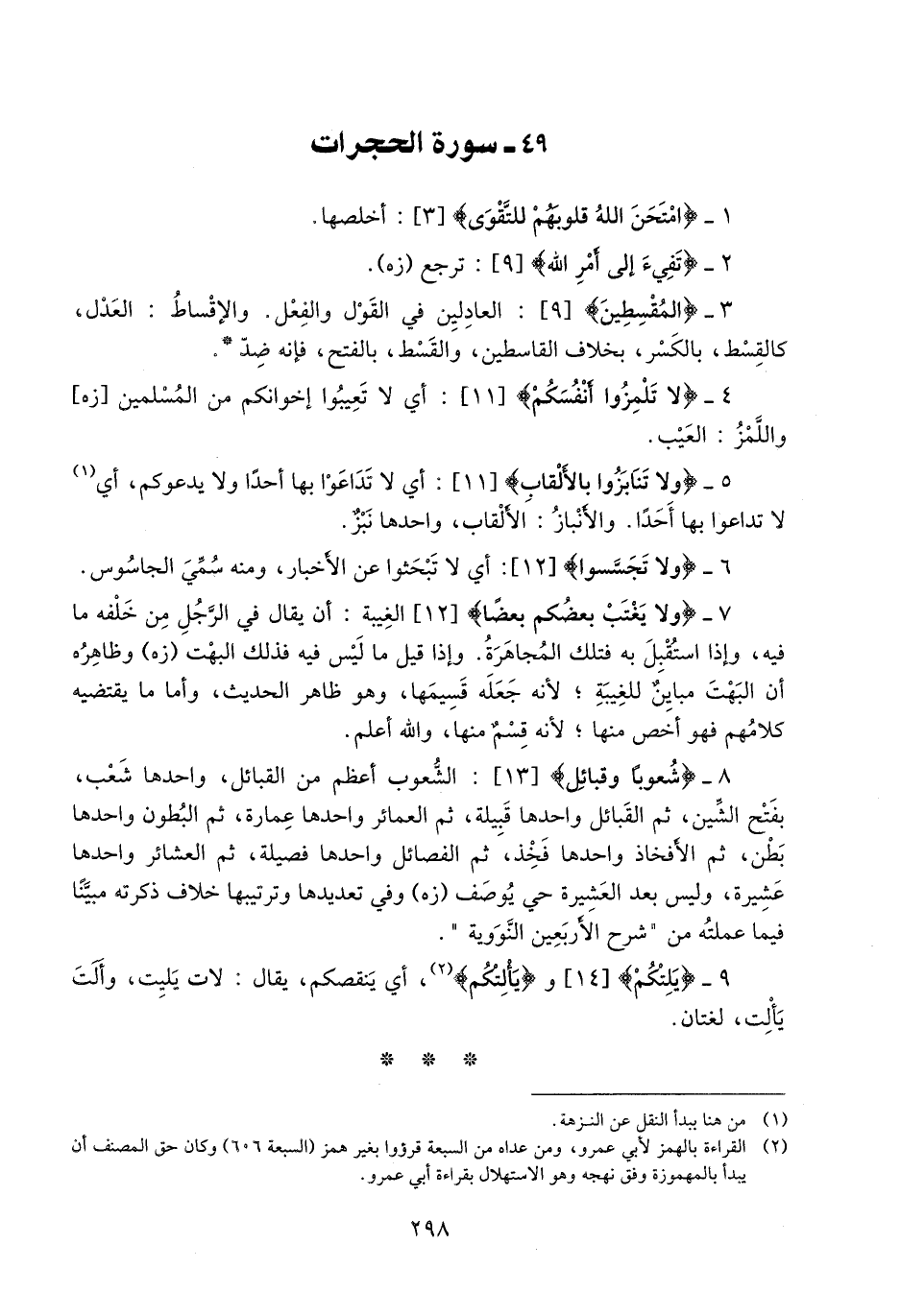 8- شُعُوباً وَقَبائِلَ [13] : الشّعوب أعظم من القبائل، واحدها شعب، بفتح الشّين، ثم القبائل واحدها قبيلة، ثم العمائر واحدها عمارة، ثم البطون واحدها بطن، ثم الأفخاذ واحدها فخذ، ثم الفصائل واحدها فصيلة، ثم العشائر واحدها عشيرة، وليس بعد العشيرة حي يوصف (زه) وفي تعديدها وترتيبها خلاف ذكرته مبيّنا فيما عملته من «شرح الأربعين النّووية» .