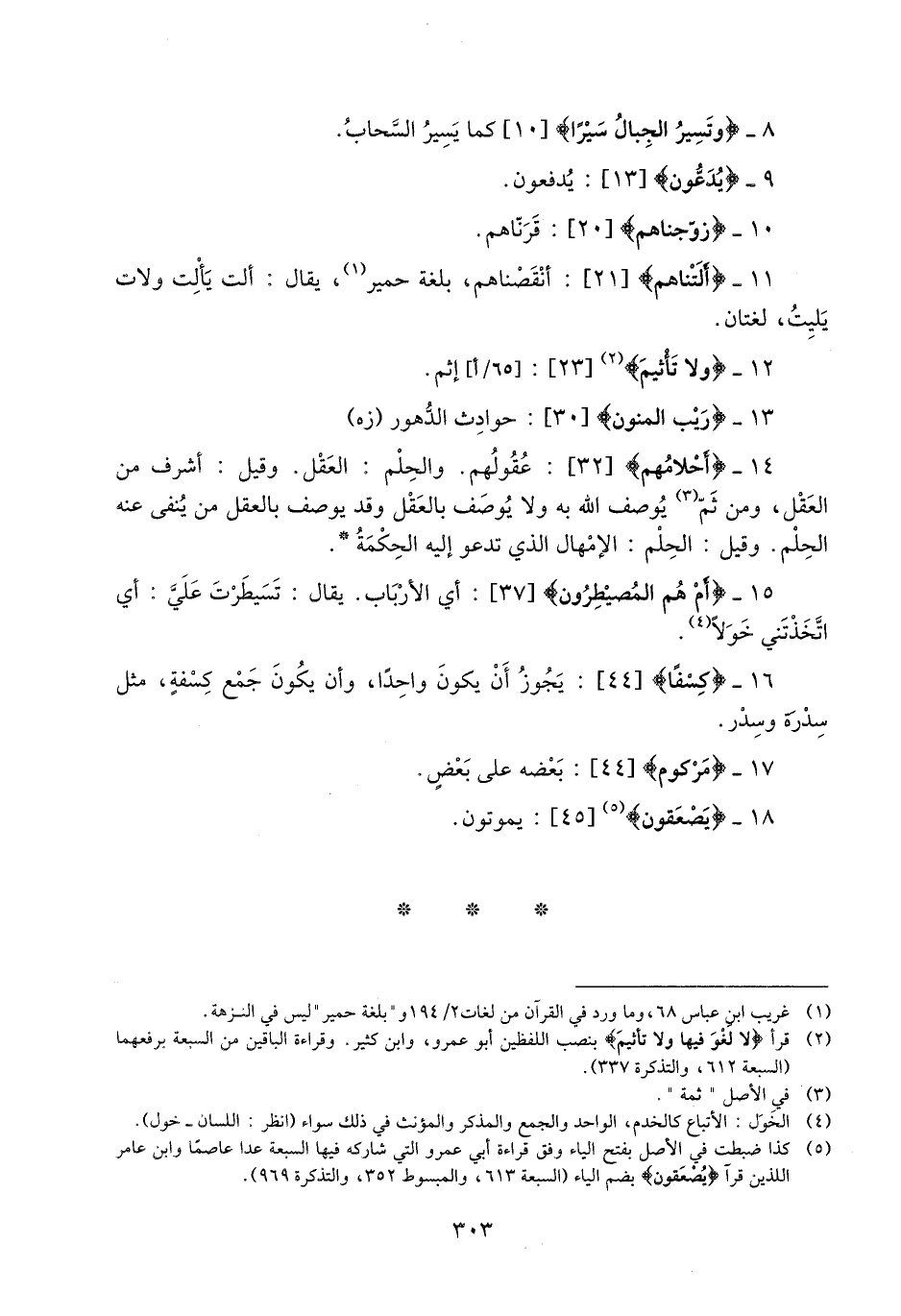 13- رَيْبَ الْمَنُونِ [30] : حوادث الدّهور (زه) 14- أَحْلامُهُمْ [32] : عقولهم. والحلم: العقل. وقيل: أشرف من العقل، ومن ثمّ «3» يوصف الله به ولا يوصف بالعقل وقد يوصف بالعقل من ينفى عنه الحلم. وقيل: الحلم: الإمهال الذي تدعو إليه الحكمة.