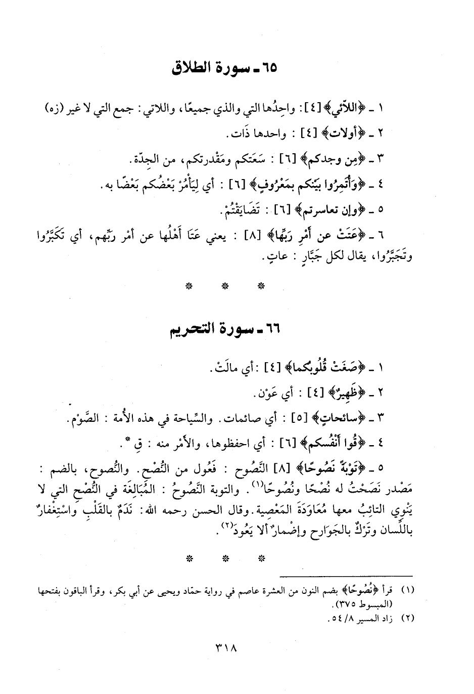 (1) قرأ نَصُوحاً بضم النون من العشرة عاصم في رواية حمّاد ويحيى عن أبي بكر، وقرأ الباقون بفتحها (المبسوط 375) .