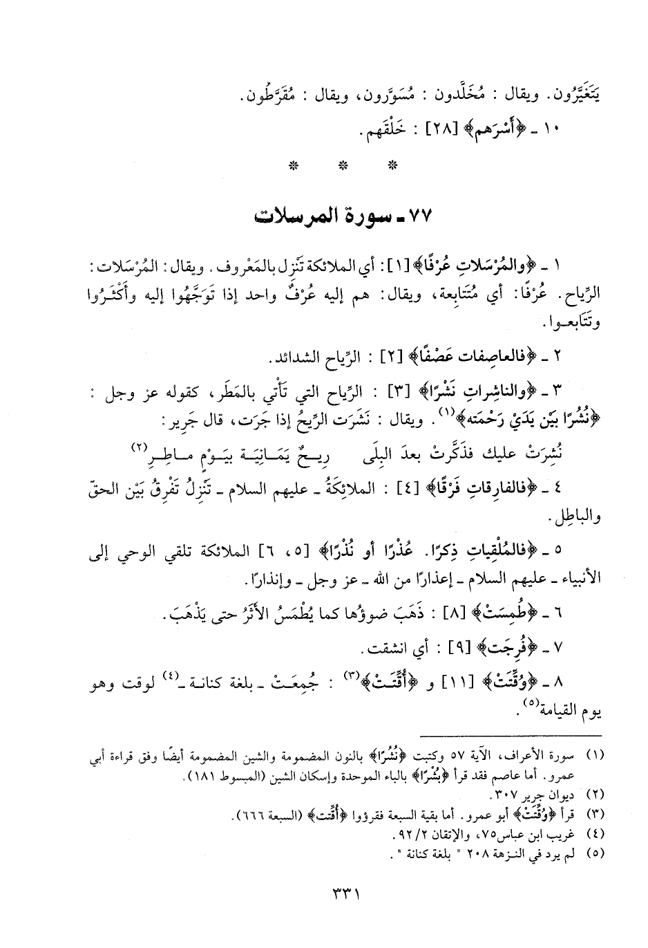 1- وَالْمُرْسَلاتِ عُرْفاً [1] : أي الملائكة تنزل بالمعروف. ويقال: المرسلات: