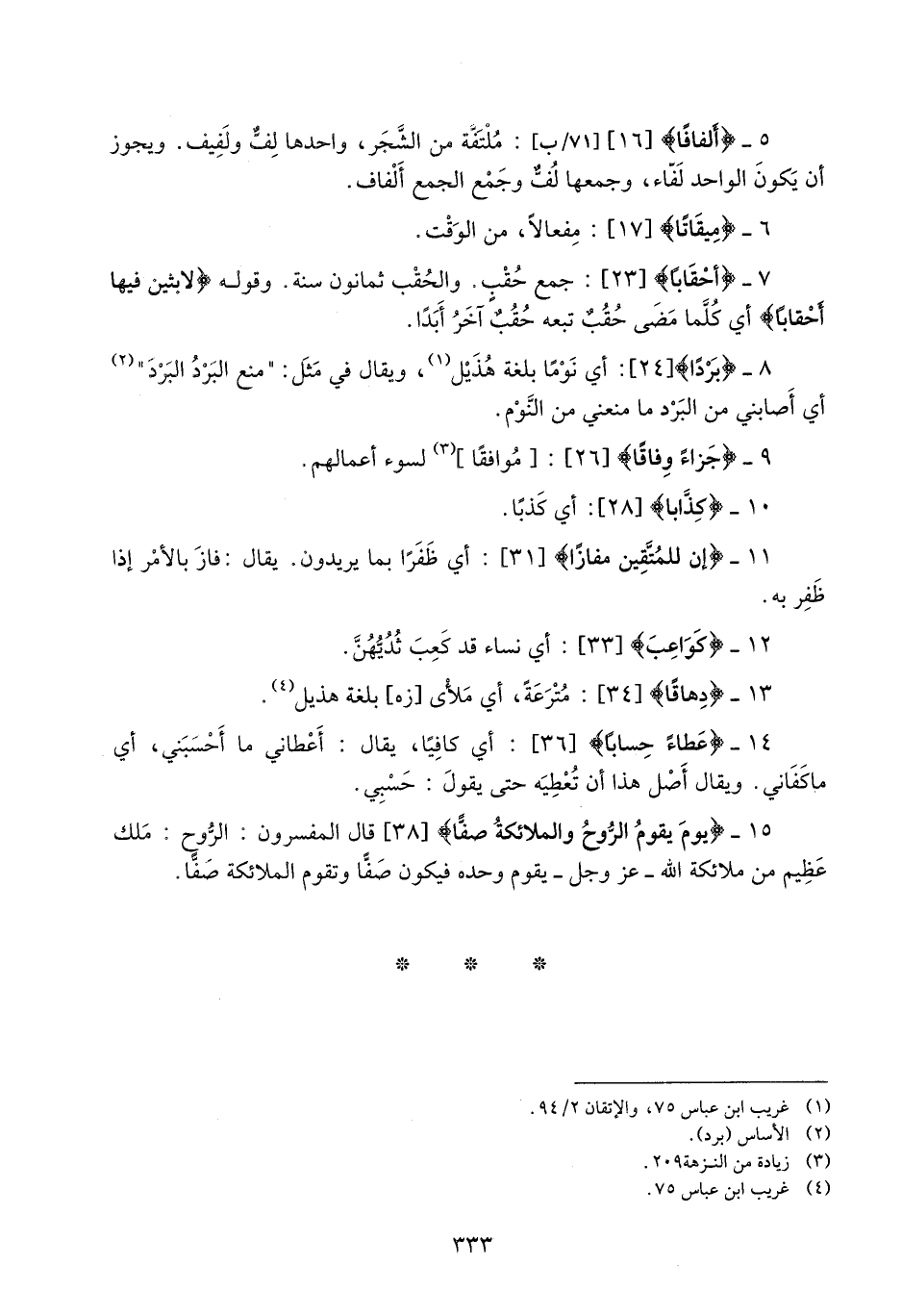 8- بَرْداً [24] : أي نوما بلغة هذيل «1» ، ويقال في مثل: «منع البرد البرد» «2» أي أصابني من البرد ما منعني من النّوم.