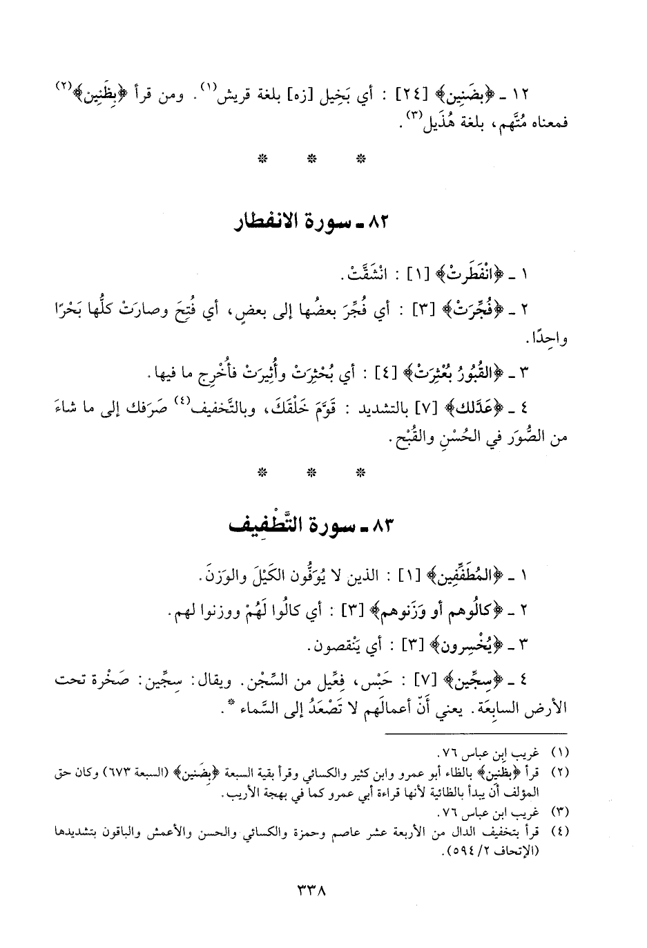 (2) قرأ بظنين بالظاء أبو عمرو وابن كثير والكسائي وقرأ بقية السبعة بِضَنِينٍ (السبعة 673) وكان حق المؤلف أن يبدأ بالظائية لأنها قراءة أبي عمرو كما في بهجة الأريب. [.....]